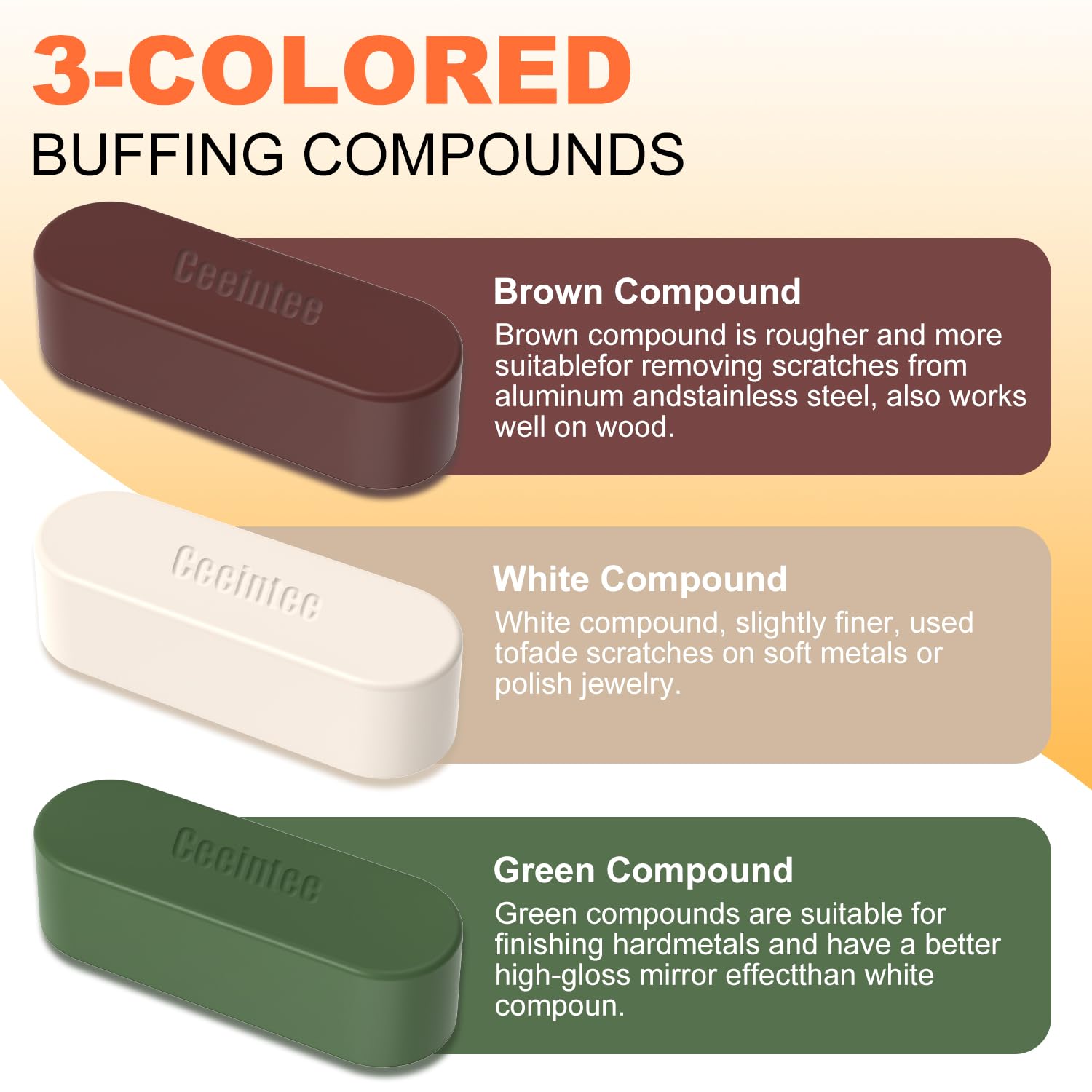 Dedicated Polishes: 3 different functional polishes are available, brown for aluminium and stainless steel, white for soft metals and jewellery, and green for hard metals, to achieve polishing results on different materials.