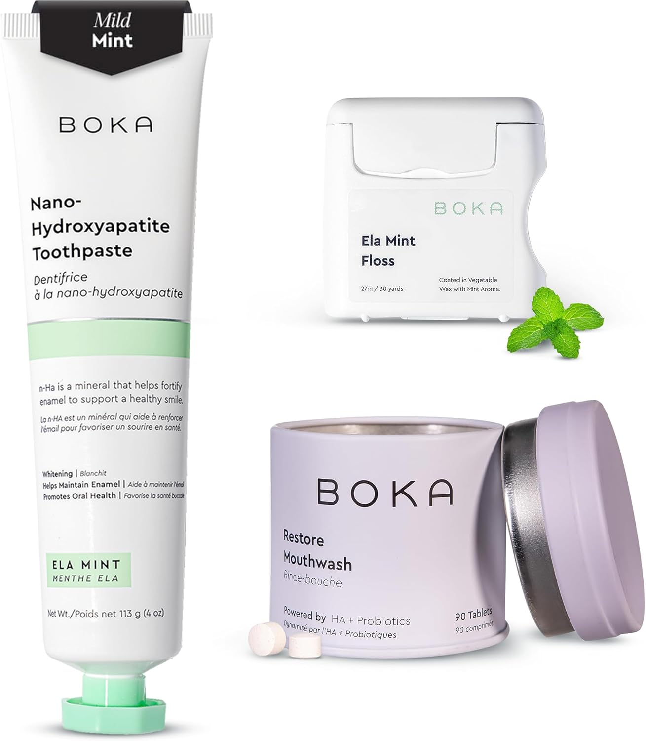 Boka Ela Mint Pack - Fluoride Free Toothpaste with Nano Hydroxyapatite, Ela Mint 4oz, Woven Dental Floss and Mouthwash Tablets - Hydroxyapatite, Fluoride/Alcohol Free & Eco-Friendly