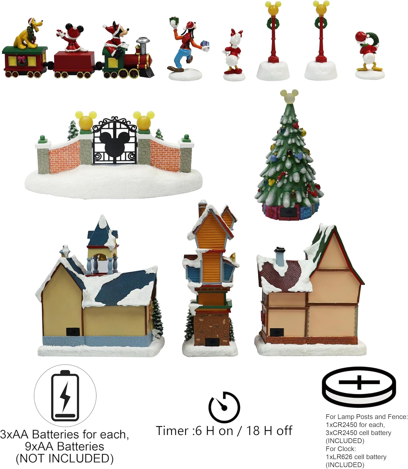 MOMENTS IN TIME 13 Pieces Disney Characters and Christmas Buildings with Music and LED lights with Timer. ✔️ Featuring hand painted and hand crafted Cartoon Characters ✔️ LED lights will bring the holiday cheer! ✔️ Plays 8 Classic Christmas Songs: We Wish You A Merry Christmas; O Christmas Tree; Jingle Bells; Deck the Halls; The First Noel; Joy to the World; Hark, the Herald Angels Sing; Silent Night ✔️ Cordless Battery operated (3 C batteries not included) ✔️ Comes with a built-in timer ( 6 hours On / 18 hours Off)