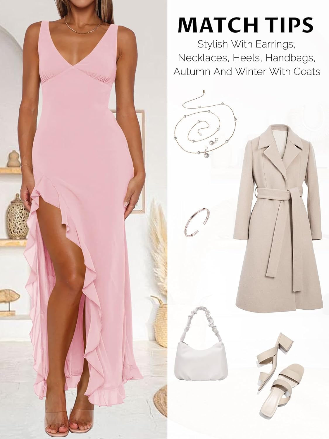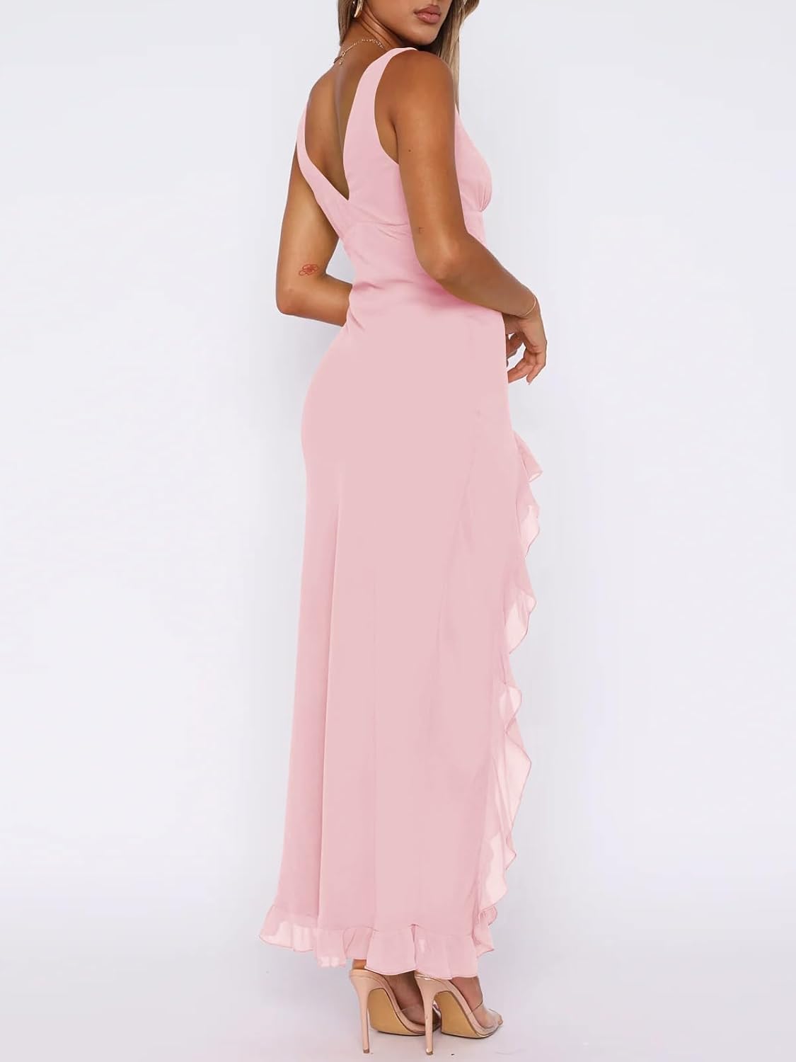 Women Sexy V Neck Sleeveless Mesh Ruffle Hem Bodycon Maxi Casual Backless High Slit Cocktail Party Dress