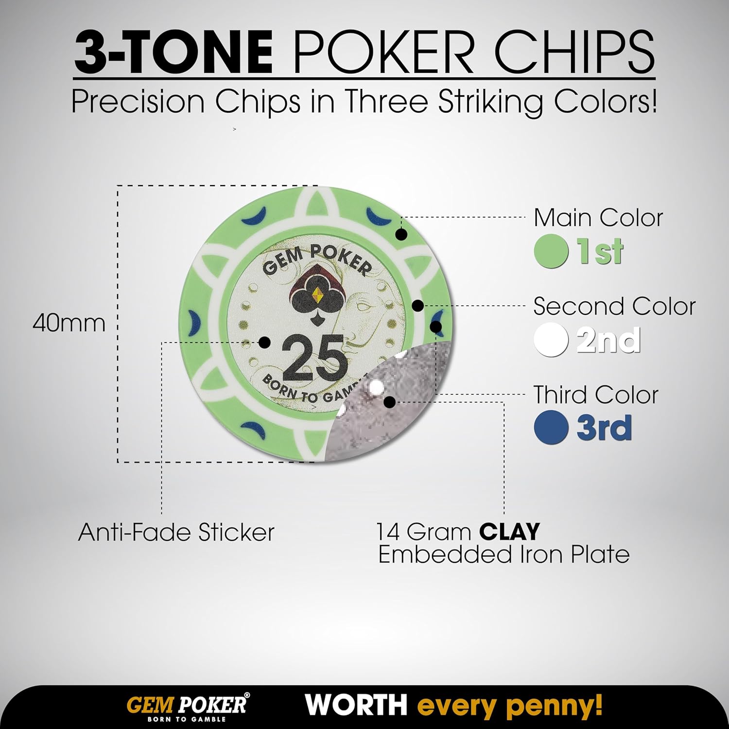 [Premium Quality] These poker chips are made from Clay Composite with an iron core. Each chip weighs 14 grams, size 39x3 mm, and features a uniquely designed pattern and color. The chips provide a firm grip and an authentic Casino experience.