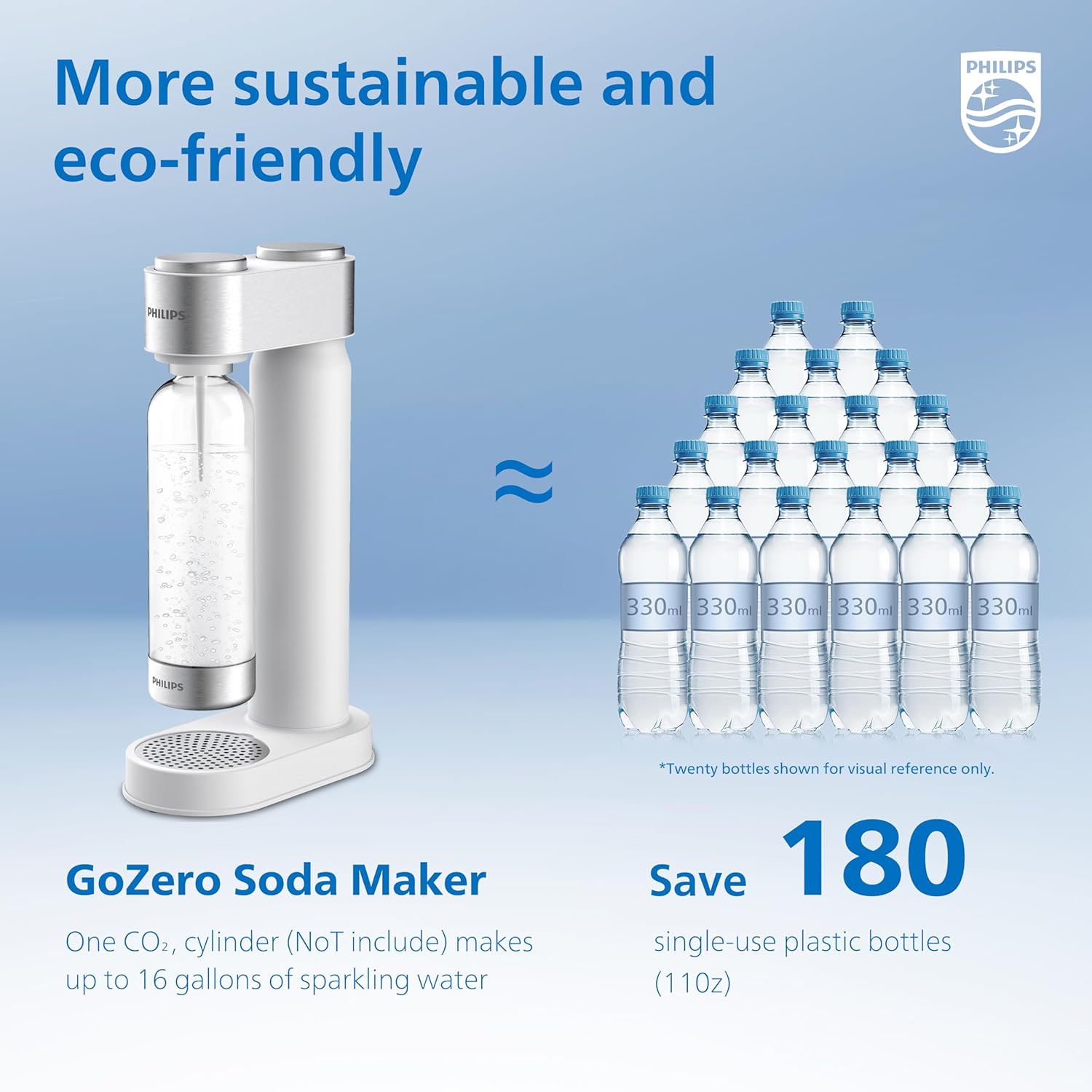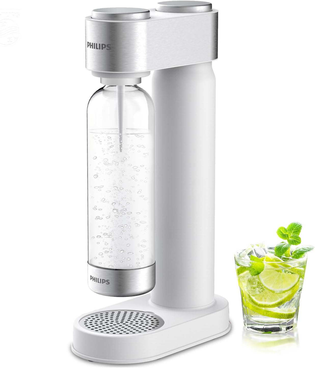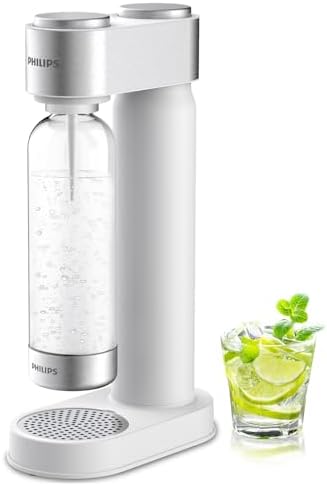 Philips Soda Water Machine - Electricity-free, creates sparkling water & soda drinks at home/outdoors. Fill bottle with cold water between lines. Compact (18.6"x9.4"x7.8"), fits countertops. Advanced water carbonation tech, customizable fizz level. Compatible with 60L CO₂ exchange carbonator (separate purchase). One cylinder makes 60L sparkling water maker, replacing 120 plastic bottles. Includes: 1 machine, 1 BPA-free bottle with cup (1L, airtight lid). Note: Rinse bottle before use. A𝘁𝘁𝗲𝗻𝘁𝗶𝗼𝗻: T𝗵𝗲 𝗻𝗲𝘄 𝘃𝗲𝗿𝘀𝗶𝗼𝗻 𝗾𝘂𝗶𝗰𝗸 𝘁𝘄𝗶𝘀𝘁 𝘀𝗼𝗱a 𝗺a𝗸𝗲𝗿 𝗼𝗻𝗹𝘆 a𝗱a𝗽𝘁 𝘁𝗼 𝗾𝘂𝗶𝗰𝗸 𝘁𝘄𝗶𝘀𝘁 𝗰a𝗿𝗯𝗼𝗻a𝘁𝗲𝗱 𝗯𝗼𝘁𝘁𝗹𝗲 𝗼𝗳 𝗺𝗼𝗱𝗲𝗹# ADD916/37, ADD910BKOQ/37, ADD910WHOQ/37, G𝗼 a𝗻𝗱 𝗴𝗲𝘁 𝗿𝗲𝗽𝗹a𝗰𝗲𝗺𝗲𝗻𝘁 N𝗼𝘄!