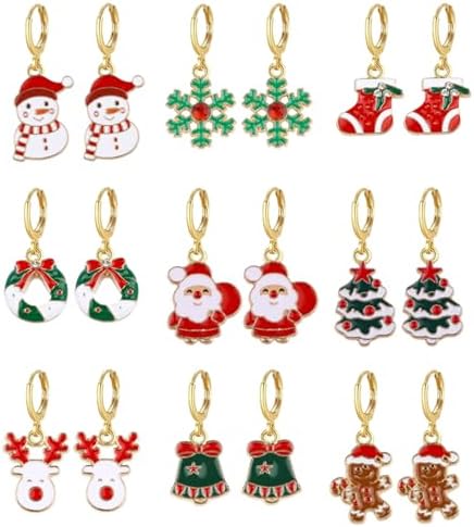 Dreuyet 9 Pairs Christmas Hoop Earrings for Women Cute Christmas Trees Bells Santa Claus Snowflakes Stocking Huggie Earrings Holiday Earrings Hoops Xmas Party Jewelry Gift