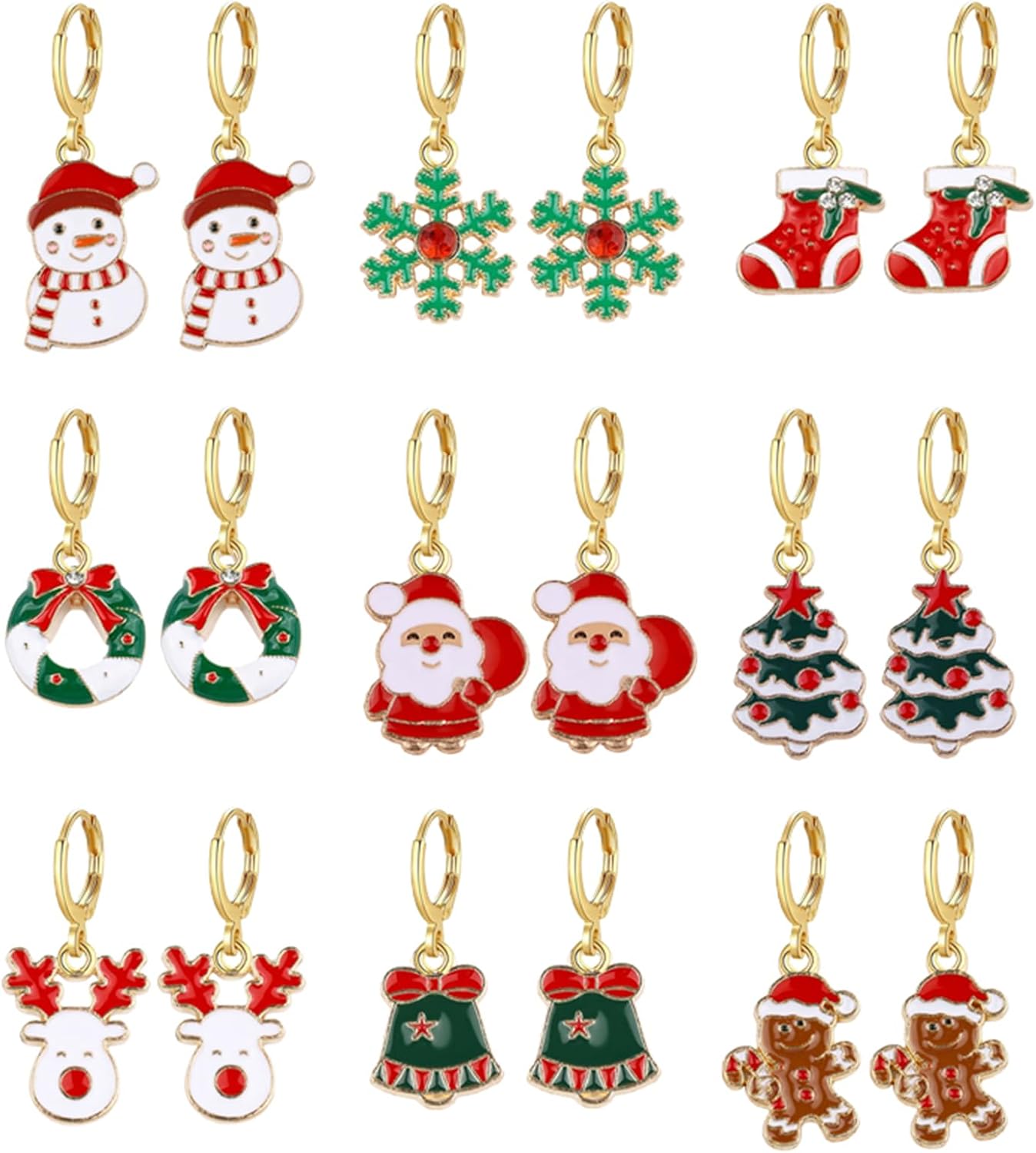 Get ready to sparkle this Christmas with these adorable hoop earrings! This set includes 9 pairs of festive hoops featuring charming designs like Christmas trees, bells, Santa Claus, snowflakes, and stockings. Crafted with care, these huggie earrings are the perfect touch of holiday cheer for any outfit. Lightweight and comfortable, you can wear them all season long for parties, gatherings, or just spreading some extra Christmas joy. Treat yourself or surprise a loved one with this delightful jewelry gift set. Celebrate in style with these merry and bright hoop earrings!