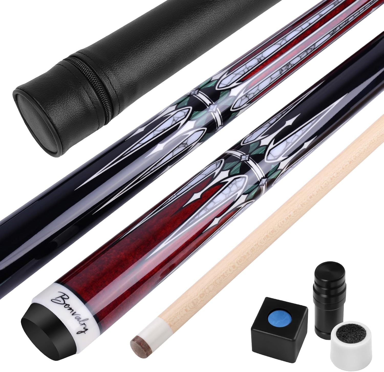Bonvalry Stained Maple Pool Cue and Case come with accessories 13mm Layered Hard Tip Selected Canadian maple shaft Canadian stained maple cue butt and forearm No-wrap handle 1 butt 1 shaft black hard case 1 pieces of chalk Chalk holder Tip scuffer/shaper