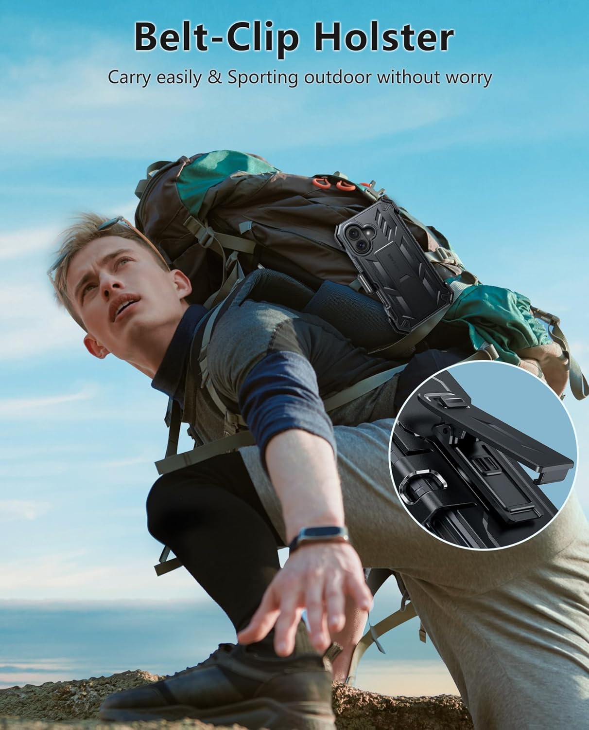 360 Rotatable Belt-Clip Holster: This clip-on full coverage armour holster can hold your cellphone securely, easy release and encase iphone16 back and hold in. You can use it as a backup protection or clip it on pants belt, backpack strap or else. Provides all round protection for your mobile phone case in all activities,especially when working outdoors,doing sports,camping,traveling