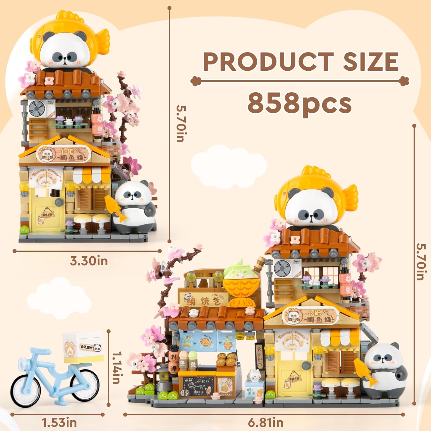 Finger Rock Street View Mini City Taiyaki Shop Building Set, Cute Panda Animals Building Toys Creative Architecture Set, Ideas Gifts for Adults Kids 8+ (858PCS)
