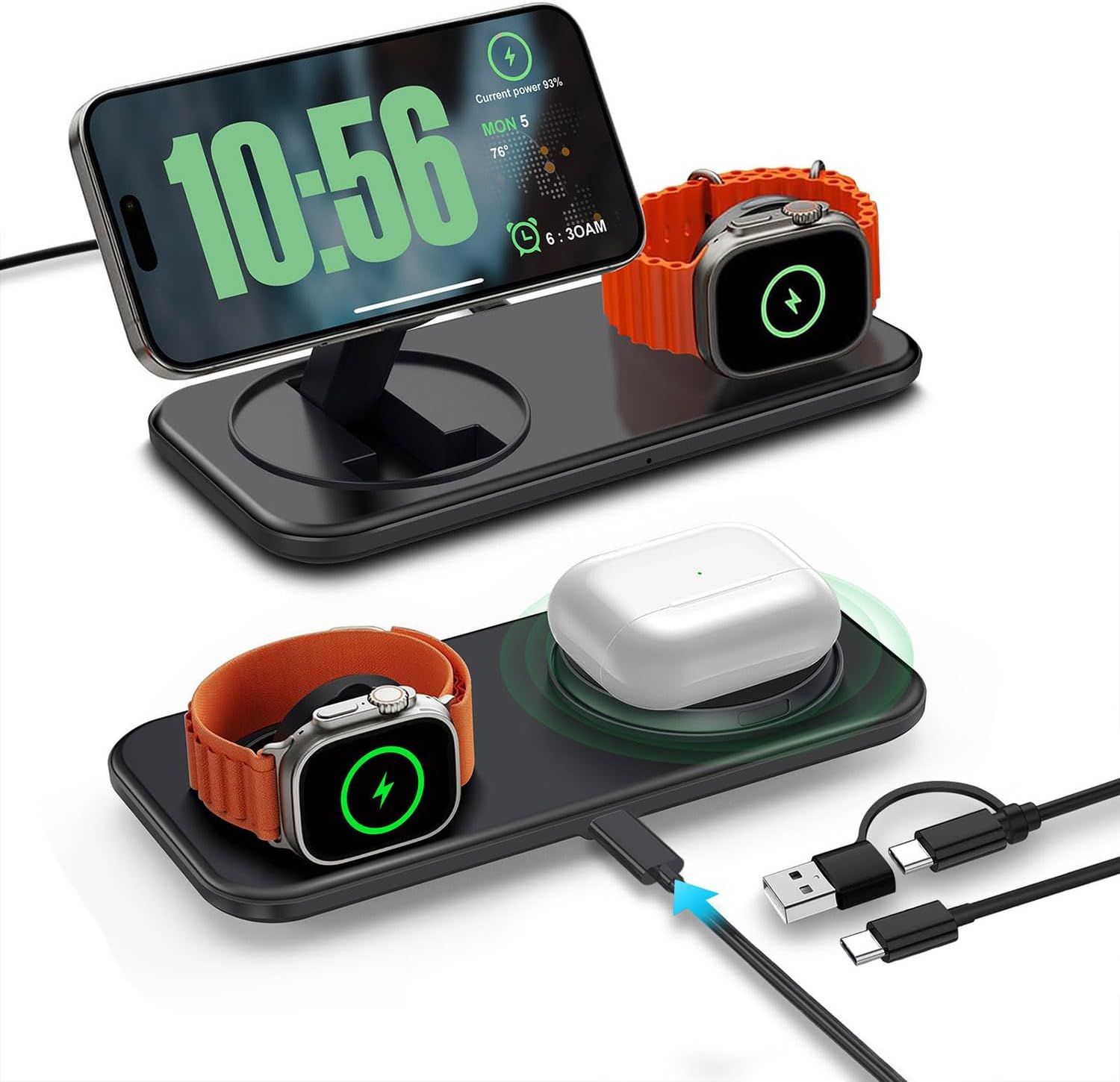 【Wide Compatibility】The wireless charger stand compatible with Mag-safe charging, 15W/7.5W magnetic wireless charging for iPhone 17 Pro Max/16/15/14/13/12 series; The mobile phone wireless charging pad (when folded) is compatible with AirPods Pro2/ Pro 3/4(ANC)/3/2 and iPhone 11/11 Pro Max/XR/XR/8/8 Plus; The watch magnetic wireless charging Compatible with Apple Watch Series 11/10/9/8/7/6/SE/5/4/3/2/Ultra/Ultra2. (NOTE: Does not support for Galaxy Watch Series)