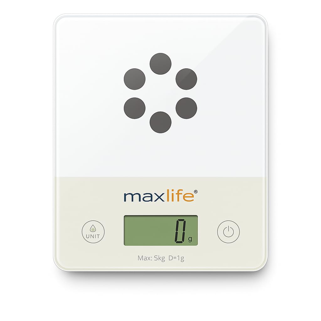 The Max Life Digital Kitchen Scale is designed for precise food measurements, offering high accuracy from 1 g to 5 kg (0.002 lb to 11 lb). With a sleek, modern design featuring 4mm tempered glass, a large LCD display, and a tare function, this kitchen scale is perfect for any home chef. It offers multiple measurement units for both solid and liquid ingredients, making it an essential tool for baking, cooking, and portion control.Product Features:High Accuracy Measurement: Measures from 1 g to 5 kg (0.002 lb to 11 lb) with precision.Multi-Unit Conversion: Supports measurements in kg, g, lb, oz, ml, fl oz, and specialized milk measuring mode.Tare Function: Easily reset the scale to zero after adding containers for accurate measurements.Slim and Modern Design: Features a 4mm thick tempered glass surface and a sleek plastic bottom for a stylish appearance.Easy-to-Read LCD Display: Large, clear LCD screen for quick and easy reading.Intended Use:Cooking and Baking: Perfect for accurately measuring ingredients for recipes.Health-Conscious Cooking: Ideal for portion control and meal planning.Liquid Measurements: Measures milk, water, and other liquids with dedicated modes.Home and Professional Use: Suitable for home kitchens, catering, and culinary enthusiasts.Simple and Convenient Storage: Slim profile fits easily into kitchen drawers and cabinets.Product Details:Brand: Max LifeMaterial: Tempered Glass Top, High-Quality Plastic BottomWeight Range: 1 g to 5 kg (0.002 lb to 11 lb)Units of Measure: kg, g, lb, oz, ml, fl oz