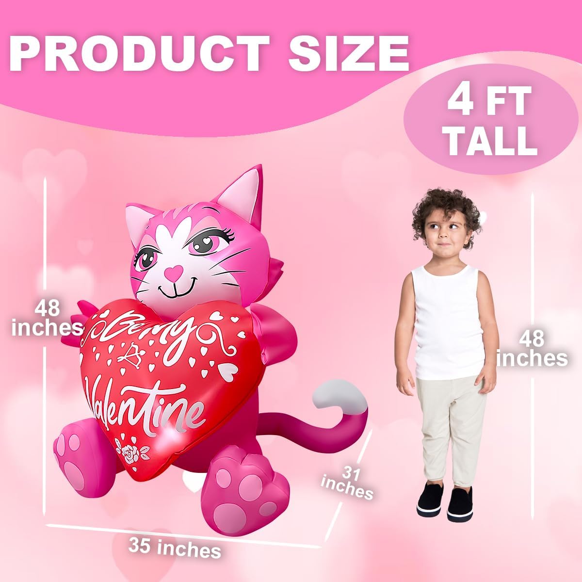 4FT Valentine's Day Inflatables Cute Pink Cat with Heart Decorations Built-in LED Lighted Blow Up Decor Indoor Outdoor Holiday Art Decor Romantic Gift for Anniversary Wedding Party