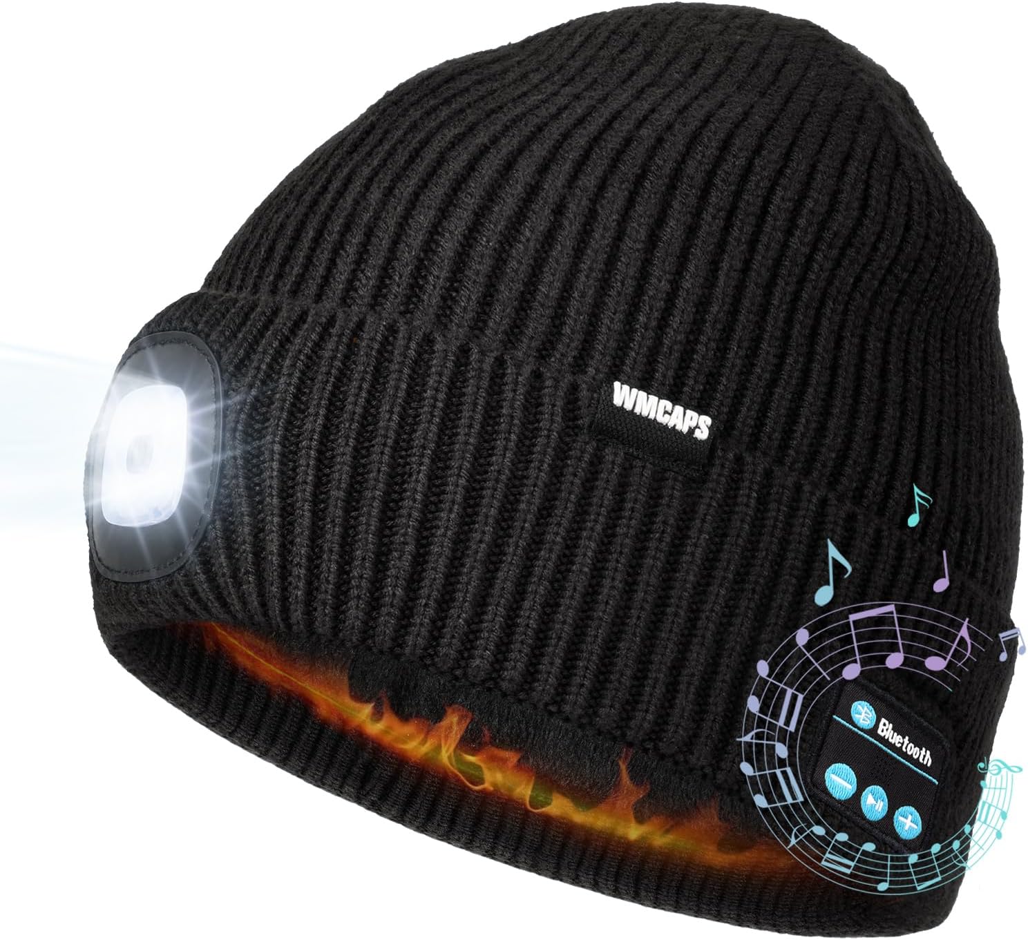 Wmcaps Fleece Lined Bluetooth LED Beanie, Winter Warm Hat with Light and Speaker Mic Cordless Headphones, Gifts for Men Dad