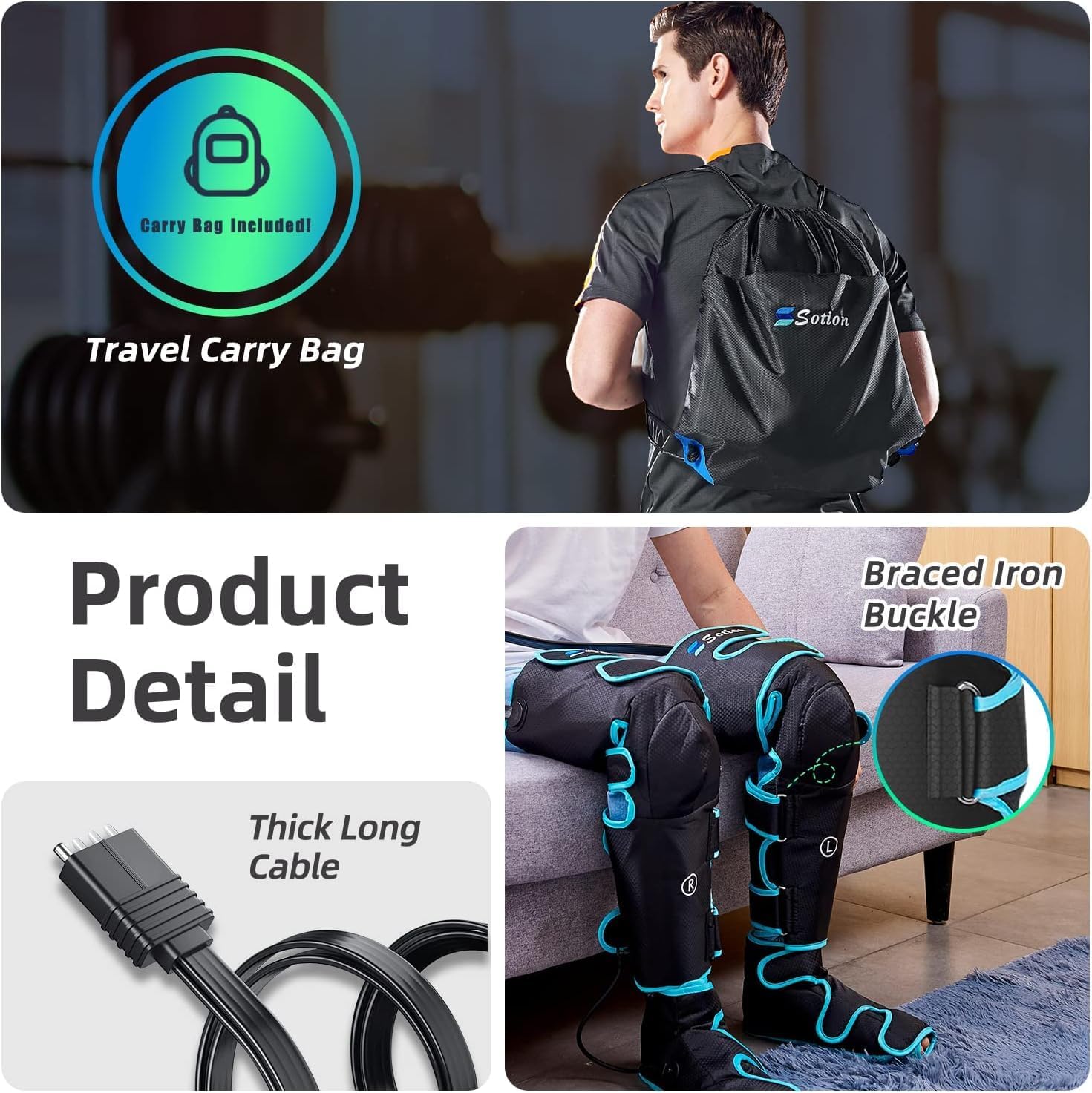 Leg Compression Massager with Heat: This leg massager is equipped with 3 levels of airbag massage intensity and 3 heat settings. The leg compression massager features 2x2 built-in airbags that inflate and deflate to mimic hand kneading, providing effective massage for the calves, ankles, and feet. It helps relieve leg fatigue and promotes better circulation.