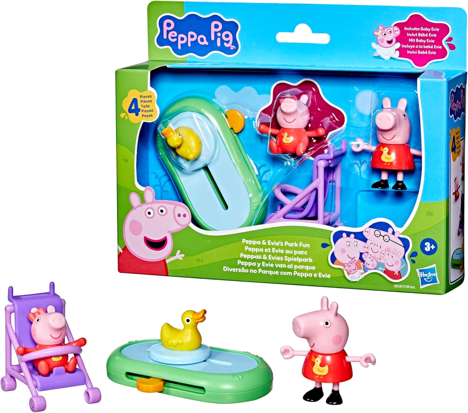 2 PEPPA PIG FAMILY FIGURES: 3-inch-scale (7.5 cm) Baby Evie and Peppa Pig figures are ready for the park with matching yellow ducks on their outfits