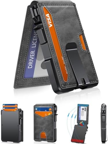QUICK ACCESS: Unlike traditional leather wallet, this mens slim wallet is equipped with the ejection mechanism. Simply press the side button on the card holder, all cards pop up at a step pattern that makes them very easy & convenient to take out.