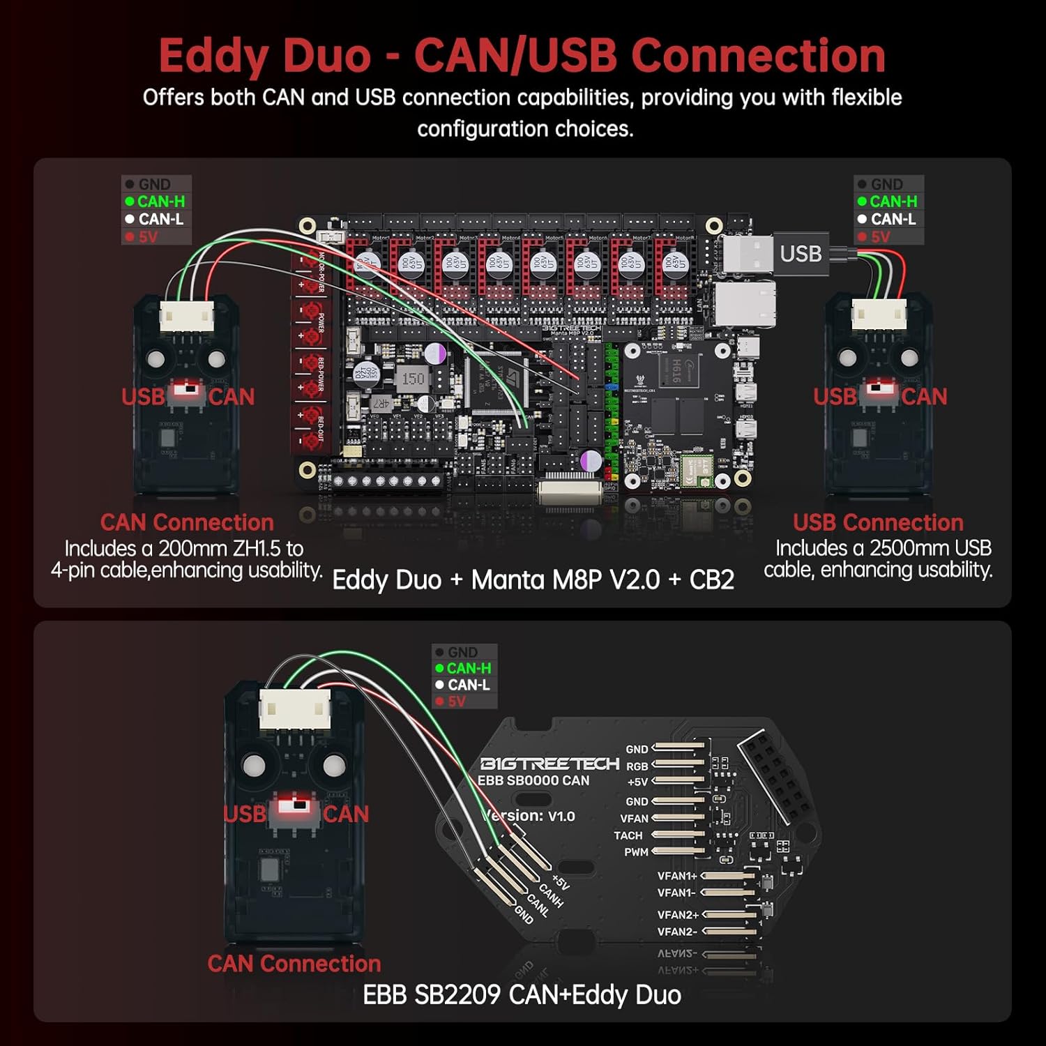BIGTREETECH Eddy Duo V1.0 comes with a customized 2.5M USB cable, which can be directly connected to the motherboards though USB, such as BIGTREETECH Pi/Pi2, Manta M8P, EBB SB2209, Manta E3EZ+CB1, Octopus MaxEZ+BTT Pi, etc., providing you with true plug and play convenience