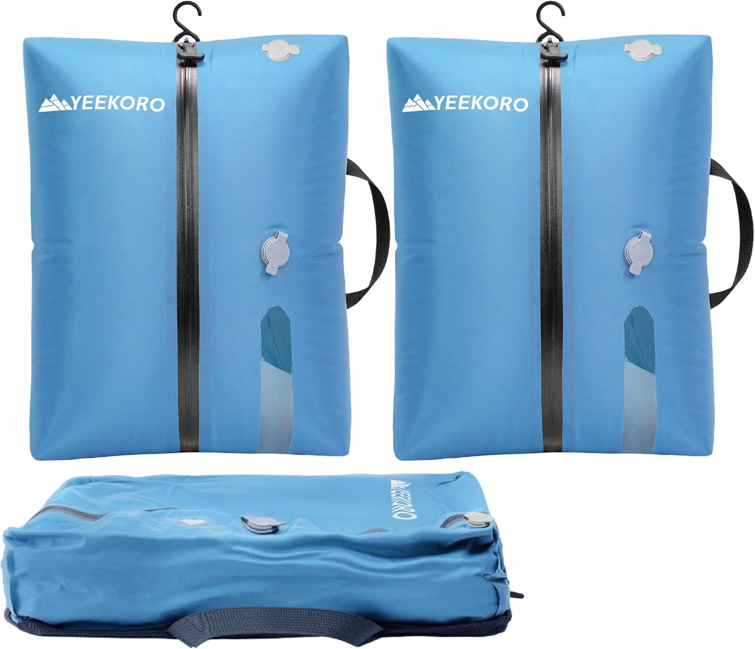 【Upgraded】YEEKORO travel vacuum bag has been upgraded in three functional details: First, added a hook, whether hanging in the wardrobe or other suitable places, are more convenient. Second, hanger webbing has been added to all four corners of the back for easy drying. Third, the number of exhaust valves is upgraded from 1 to 2, it greatly shortens the exhaust time, allowing us to use the vacuum bag to pump out the air more quickly and improve the efficiency of use.