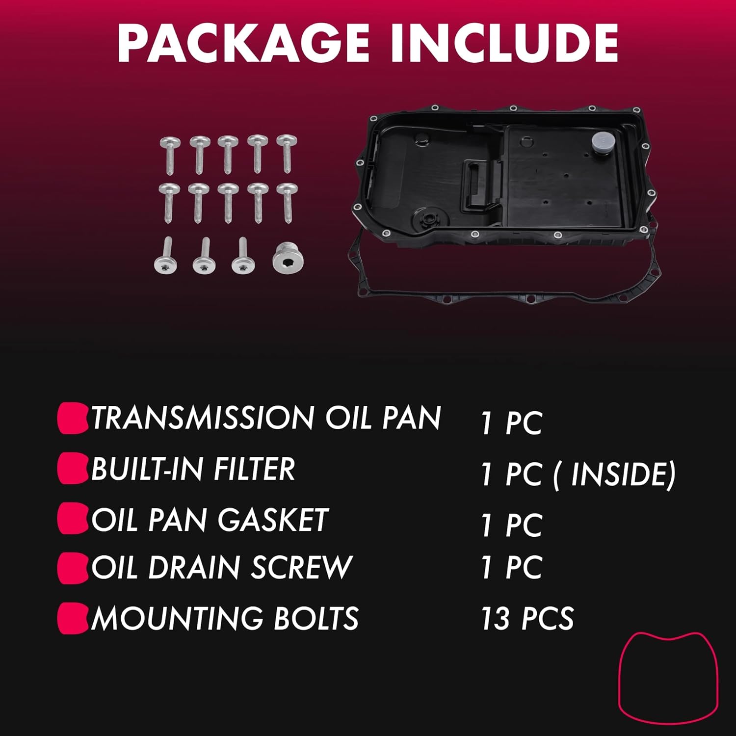 [Professional Replacement]: This transmission pan kit includes: 1 x Transmission oil pan, 1 x Built-in filter, 1 x Gasket, 1 x Oil drain screw, 13 x Bolts. Its fit for Automatic Transmission models: 845RE, 850RE, 8HP45, 8HP50, 8HP70, and 8HP75 (all 8-speed transmissions); Compatible with both RWD (Rear Wheel Drive) and standard configurations