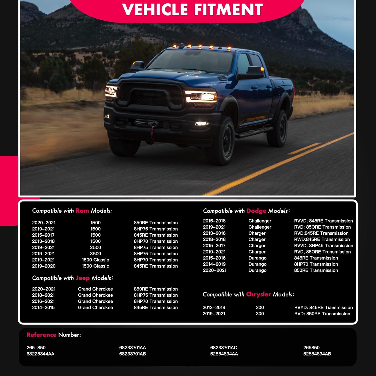 [Reference Part Number]: 265-850, 265850, 68225344AA, 68233701AA, 68233701AB, 68233701AC, 52854834AA, 52854834AB, 108298130, 1087298360, 1087298361, 0501220614B, ZF0501219037;