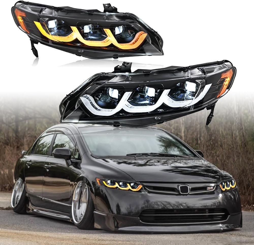 Headlights for 2006-2011 Honda Civic 4 Door Sedan Projector Headlamp with 6 Lenses Start Up Animation Sequential Turn Signal Passenger & Driver Side L+R Headlight