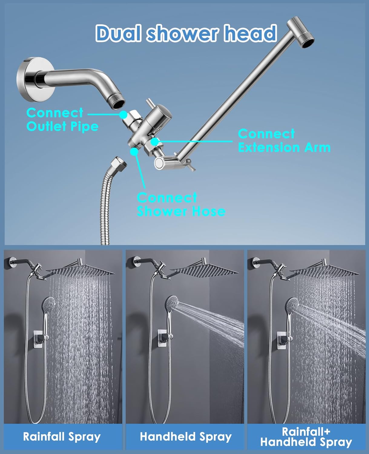 [3 Combo Modes for Customized Shower Experience] Enjoy ultimate versatility with our rainfall showerheads combo featuring (1) rainfall spray (2) handheld spray (3) rainfall + handheld spray use at the same time. Whether you're relaxing under a gentle rainfall, targeting specific areas with the handheld spray, or experiencing both for an enhanced shower, this combo provides the flexibility to meet your every need.