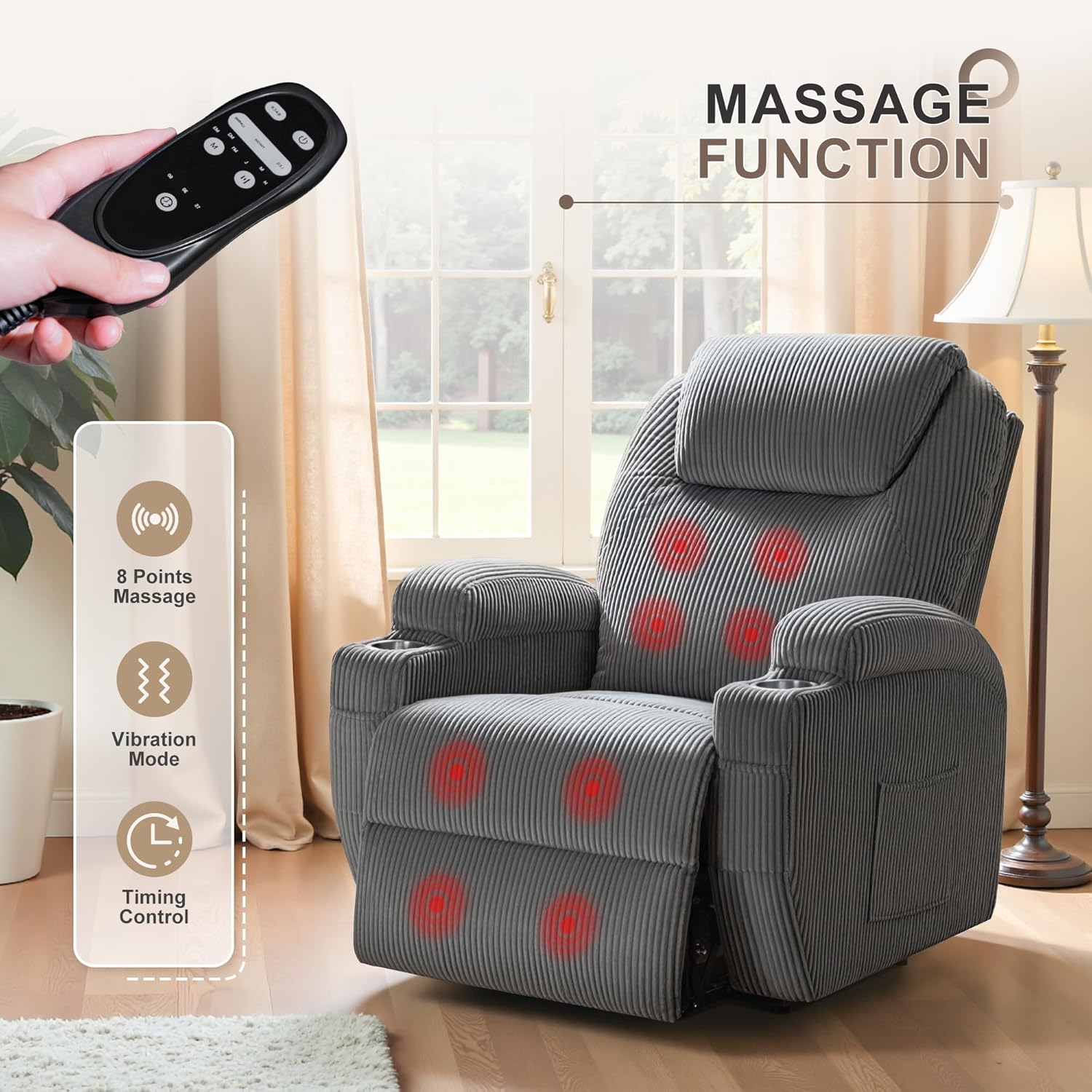 Vibration Massage: Our electric recliner chair is equipped with 8 vibration massagers that target the back, waist, thighs, and legs, effectively relieving muscle tension. With 3 adjustable modes and 3 intensity levels to choose from, it helps alleviate lower back pressure and improve blood circulation, relieving stress and fatigue. The 15/30/60-minute timer function allows you to set the massage duration conveniently.