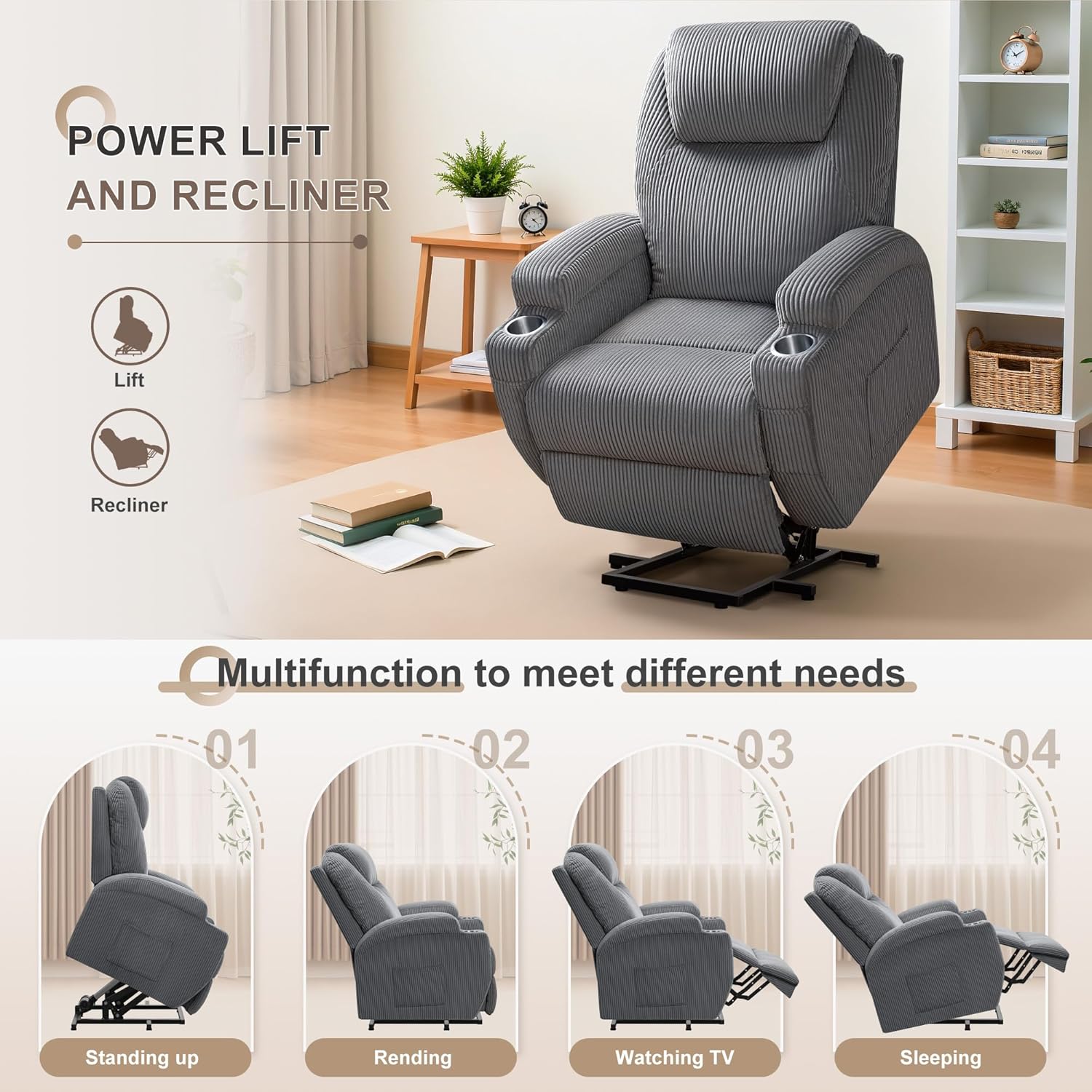 Flamaker Power Lift Recliner Chair Electric Lift Recliner for Elderly Power Lift Recliner Chair with Cup Holders Side Pockets for Living Room (Corduroy, Dark Gray)