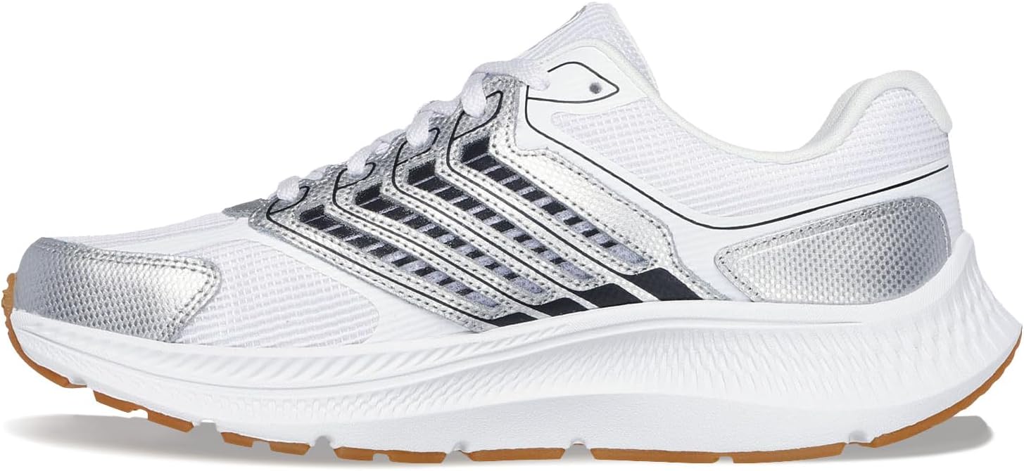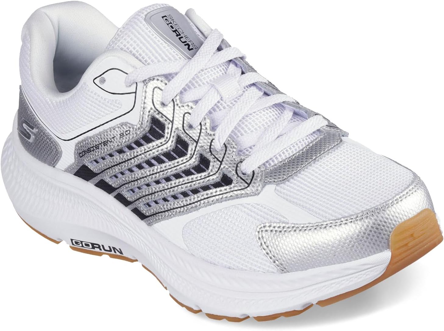 Women's Skechers, Go Run Consistent 2.0 - Aragon Sneaker. Achieve your fitness goals in style and comfort with the Skechers GO RUN Consistent 2.0 Sneaker. Engineered for performance, this sneaker features a lightweight and breathable design, responsive cushioning, and a durable outsole, making it the perfect companion for your daily runs or workouts. Breathable mesh uppers with metallic synthetic leather accentsSkechers Air-Cooled Memory Foam cushioned comfort insole for ultimate cushioning and support Lightweight and responsive ULTRA LIGHT midsole cushioning Skechers M-Strike technology, your strides will be efficient and smooth as you transition from landing to toe-off Flexible manmade outsole