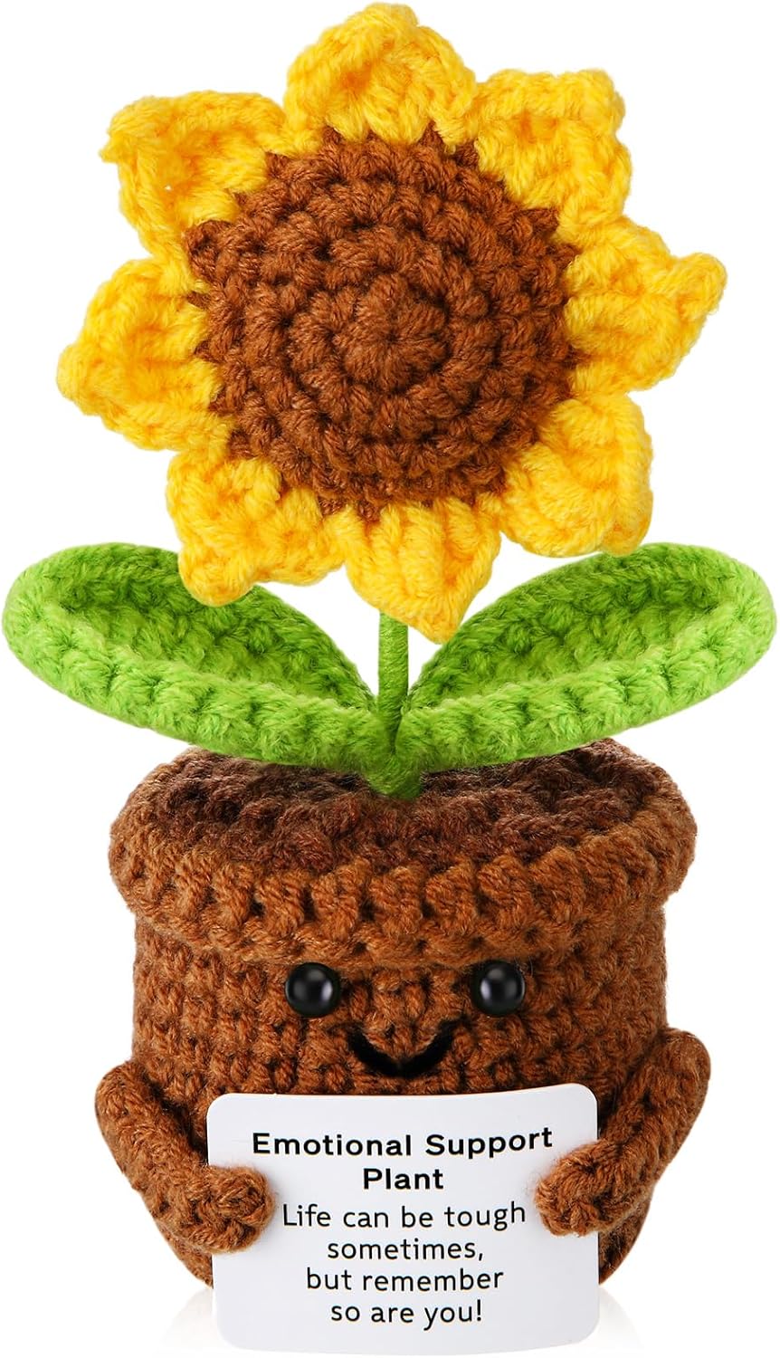 Handmade Sunflower: A delightful companion that brings smiles and spreads positivity, with its positive card makes it a creative way to uplift your friends. The emotional support plush sunflower also serves as a cute decor on your desktop or car dashboard