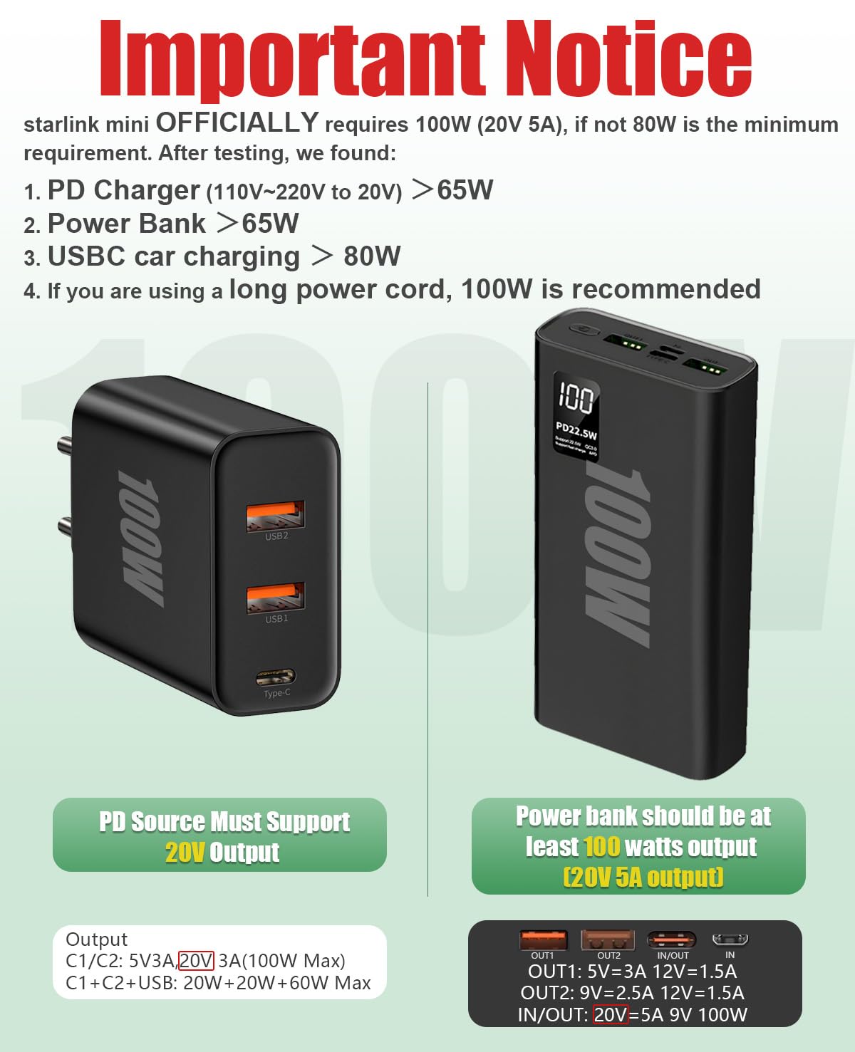 【Power Up Your Starlink Mini】Designed exclusively for the Starlink Mini, our DC 5521 female to Type-C male adapter ensures seamless power delivery of 100W (20V 5A), providing the necessary juice to keep your satellite internet connection strong and stable.