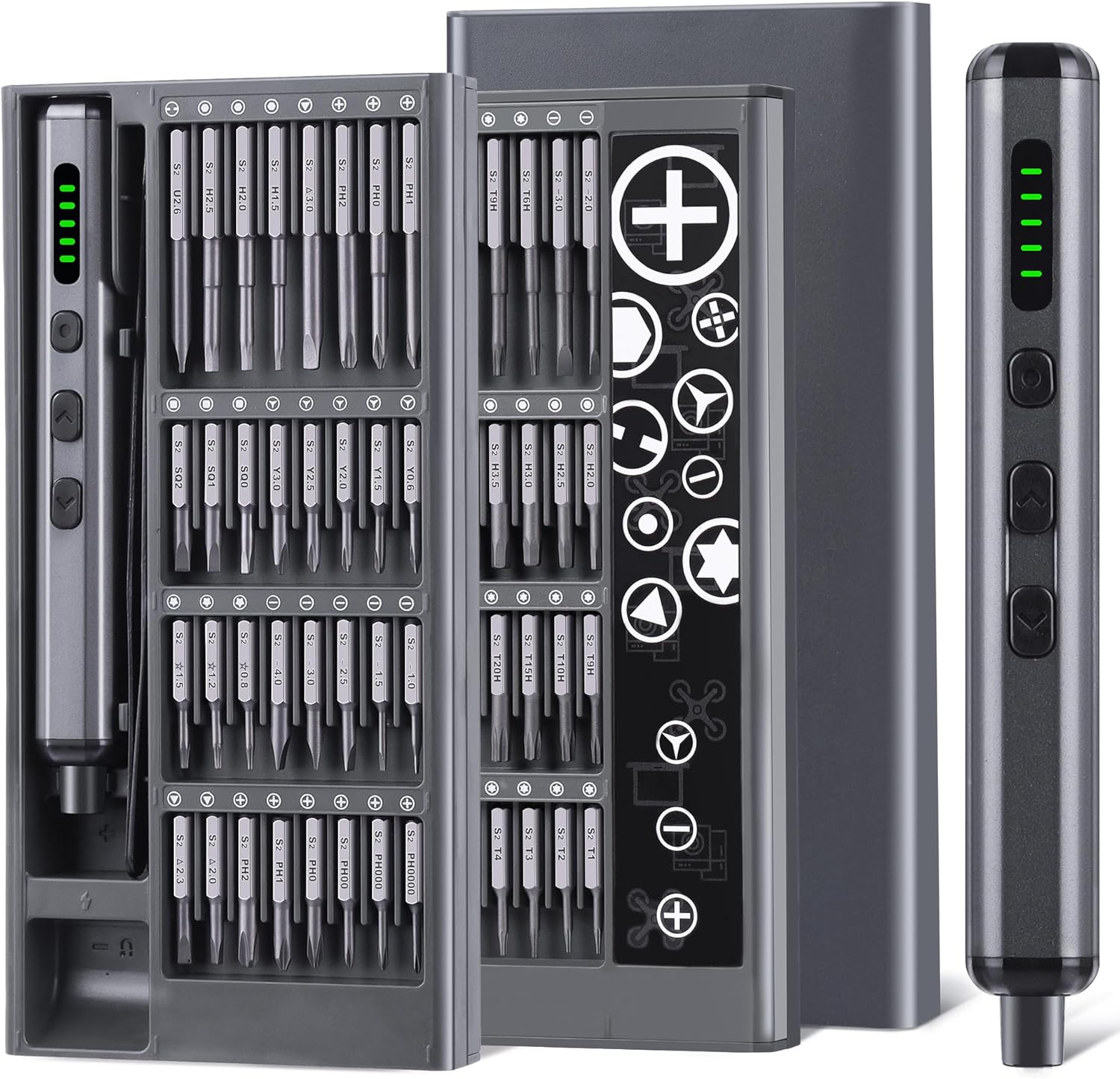 🥇 【Precision Screwdriver Heads 】- The 69 in 1 mini electric screwdriver contains a variety of precision screwdriver heads such as Phillips, Torx, Flat Head, Triwing, Hex, Pentalobe, Triangle, etc. to meet the types of screws commonly encountered. Also included are additional tools such as magnetic pad, pry bars, tweezers, etc. to help with tiny electronic components. The magnetic storage case keeps the small screwdriver heads inside organised for your convenience and placement.