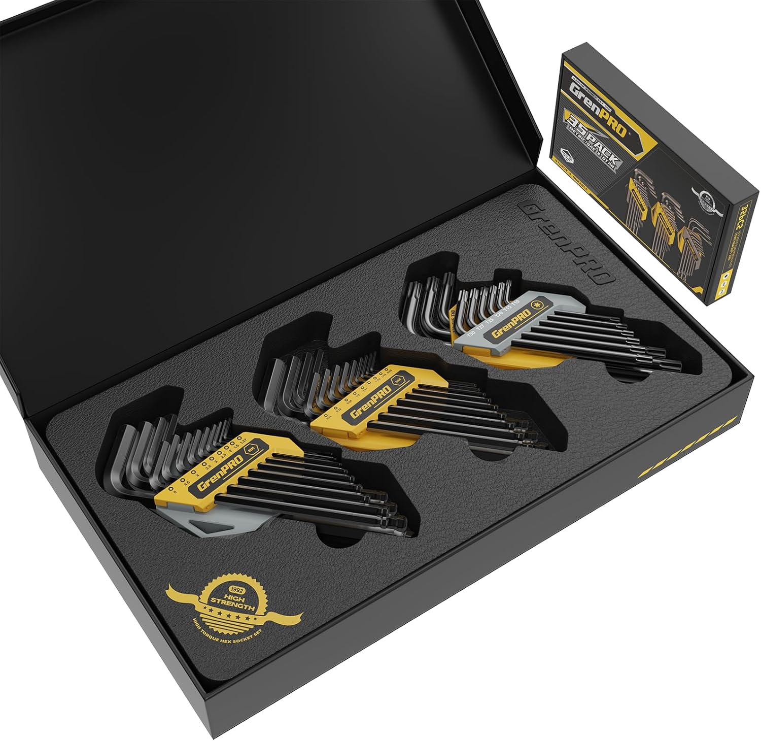 GrenPRO 35-piece allen wrenches sets Include:13-piece metric allen wrench set:1.27, 1.5, 2, 2.5, 3, 3.5, 4, 4.5, 5, 5.5, 6, 8, 10mm.13-piece SAE allan wrench sets:0.05, 1/16, 5/64, 3/32, 7/64, 1/8, 9/64, 5/32, 3/16, 7/32, 1/4, 5/16, 3/8 inch. 9-piece torx wrench set:T10, T15, T20, T25, T27, T30, T40, T50. Every allen key set is labelled with specific sizes on the surface so that you can easily get the size you want