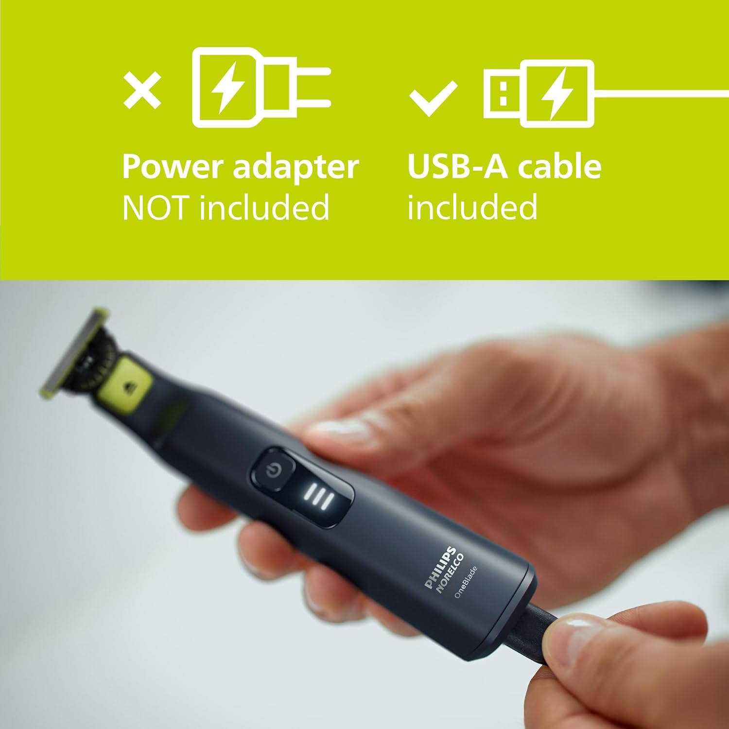 The Philips Norelco OneBlade Pro 360 Face + Body is a revolutionary new hybrid styler that can trim, shave and create clean lines and edges, on any length of hair. Forget about using multiple steps and tools. OneBlade does it all. Its shaving technology features a fast-moving cutter that moves up to 12000x per minute, which powers through any length of hair. Its dual protection system – a glide coating combined with rounded tips – makes shaving easier and more comfortable. The Innovative 360 Blade moves in all directions and adjusts to every curve of your face to maintain constant skin contact, while enabling control at all times. Easily manscape in hard‐to‐reach areas, with fewer strokes and greater comfort². Create precise edges with the dual-sided blade. You can shave in either direction to get great visibility and see every hair that you're cutting. Enjoy even more personalized trim¹ at exactly the length you want with the versatile 14-length precision trimming comb that offers length settings from 0.4 to 10mm. You also get an extra 360 Blade with a body comb (3mm) and a skin guard for your body and sensitive areas. Line up your style in seconds! Its powerful Li-Ion battery provides 90 min. runtime after 1-hour charge. The LED light shows the battery status to always know when it's time to recharge your OneBlade. OneBlade is fully waterproof, so it's easy to clean. Just rinse it under the tap. You can also use it wet or dry, with or without foam, creams, gel, or in the shower, making this a great trimmer/razor choice for men. Time to get your perfect facial style and stubble. Stainless steel blade lasts up to 4 months of use³ to keep that fresh feel. An eject icon will appear on the blade when it's time to consider changing the blade for the best shaving experience. ¹ vs. QP2724/70, QP2724/90, and QP2834/70. ² vs. its predecessor while shaving. ³ Replace every 4 months for the best shaving experience. Based on 2 full shaves per week. Actual results may vary.