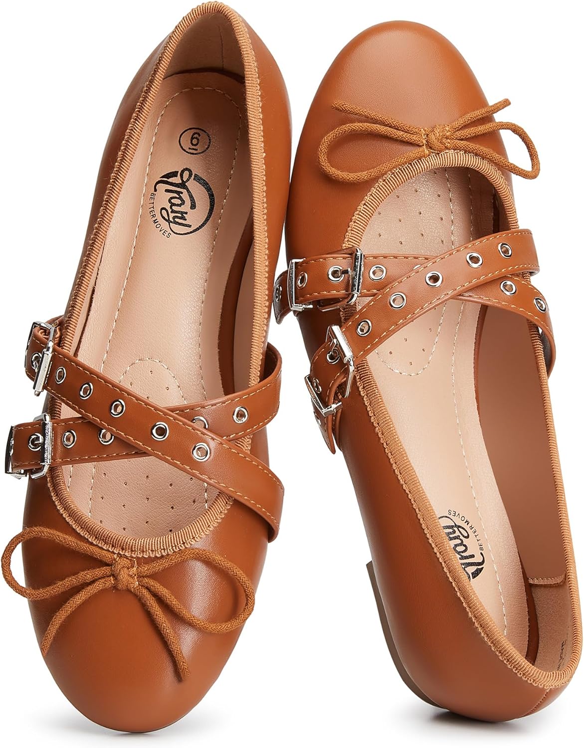 Step into a world of style and sophistication with the Trary Mary Jane Flats. These shoes take the beloved classic Mary Jane design and infuse it with a modern twist, making them a must-have addition to any fashion-forward wardrobe.Key Features: Chic Design: These Mary Jane flats feature a sleek, glossy black finish that exudes timeless elegance. The addition of silver-tone studs along the straps adds a bold, edgy flair, transforming the traditional schoolgirl look into a statement piece. Premium Materials: Crafted from high-quality materials, these flats offer durability and comfort. The soft inner lining ensures a comfortable fit, while the sturdy sole provides excellent support for all-day wear.Versatile Style: Whether you're dressing up for a night out or keeping it casual for a day at the office, these flats are incredibly versatile. Pair them with a dress for a chic look or with jeans for a more laid-back vibe. No matter the occasion, these shoes will be the highlight of your outfit.Secure Fit: The adjustable buckle straps not only enhance the shoe's aesthetic appeal but also ensure a secure and personalized fit. Walk with confidence, knowing your shoes will stay comfortably in place.Comfort Meets Fashion: Designed with both style and comfort in mind, these flats feature a cushioned insole that provides support and reduces foot fatigue, making them perfect for long days on your feet.Attention to Detail: The intricate detailing of the silver-tone studs and the elegant bow accent on the front showcase the meticulous craftsmanship that goes into each pair, ensuring you stand out with every step.Ideal For:These Edgy Elegance Mary Jane Flats are perfect for anyone looking to add a touch of sophistication and modern edge to their wardrobe. Ideal for fashion enthusiasts, professionals, and anyone who appreciates a blend of classic and contemporary styles.
