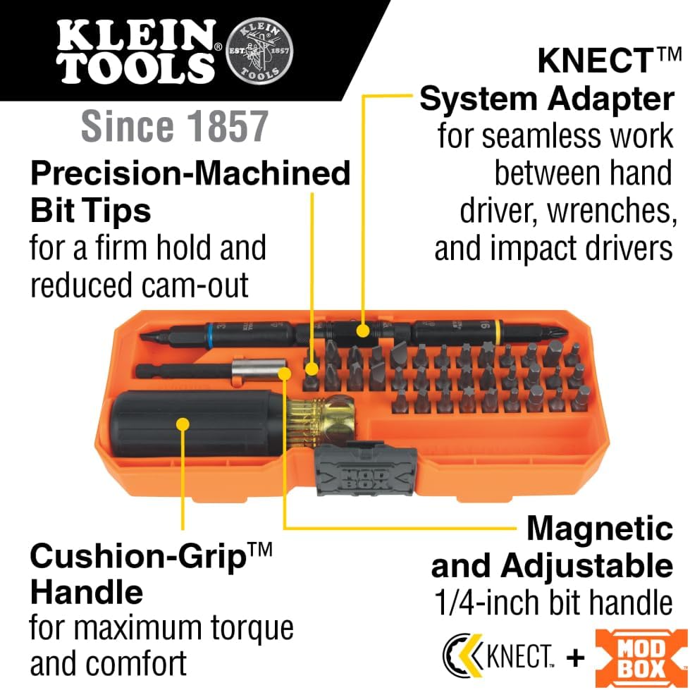 The Impact-Rated 46-Piece Multi-Bit Screwdriver / Nut Driver Set is part of Klein's KNECT system. KNECT is a cross compatible impact-rated driver and ratchet system that delivers a seamless back and forth transition between hand and power tools. This versatile set houses popular tips and nut driver sizes. It's the familiar feel of a multi-bit screwdriver set, with the added utility to complete any job. Case clips to other Klein cases and the MODbox case adapter side rail attachment.