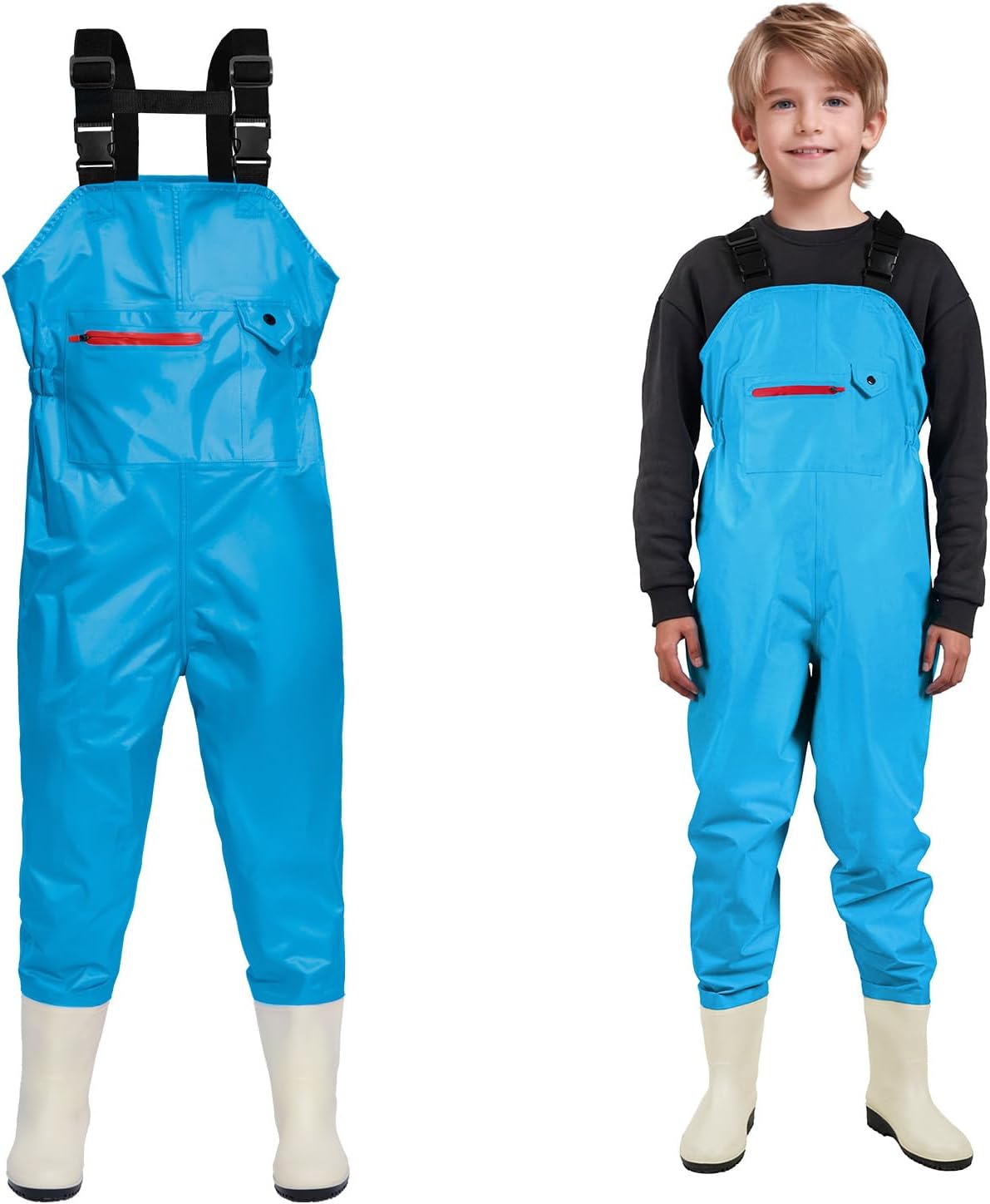 【Child-friendly Design】The multifunctional pocket in front of the chest is convenient for to keep small items. The product is equipped with adjustable elastic shoulder straps, which can be freely adjusted according to the child's body shape, providing better extensibility and excellent comfort and fit. The waist of the wading pants is designed with an elastic band, which fits the child's waist curve,it is easy to put on and take off, and can also adapt to children in different body shapes.