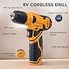 【YellowCordless Drill with LED】 This 8V cordless drill is versatile for wood and plastic drilling as well as screw tightening and loosening. With variable speed control via the trigger, it reaches up to 800 RPM no-load speed. The built-in LED light enhances visibility, and at a lightweight 1.65 pounds, it’s easy to operate single-handedly