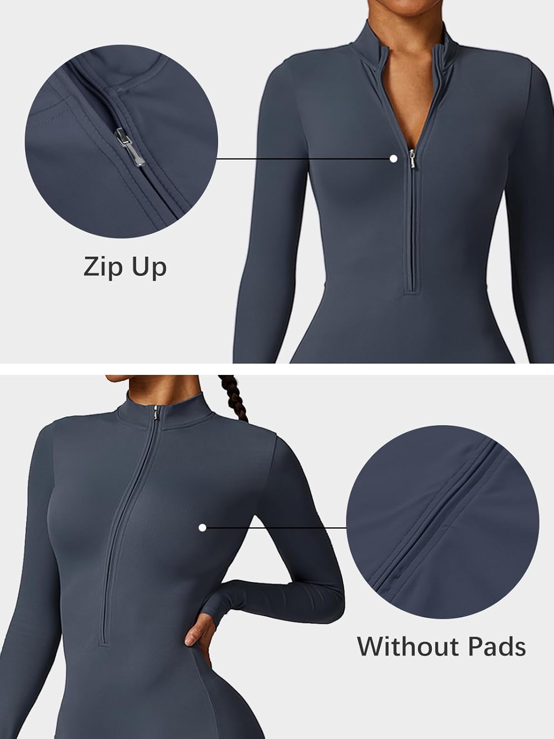 ECUPPER Women Long Sleeve Bodycon Jumpsuits Workout Zip Up Unitard One Piece Full Bodysuits Sexy Yoga Rompers Pants