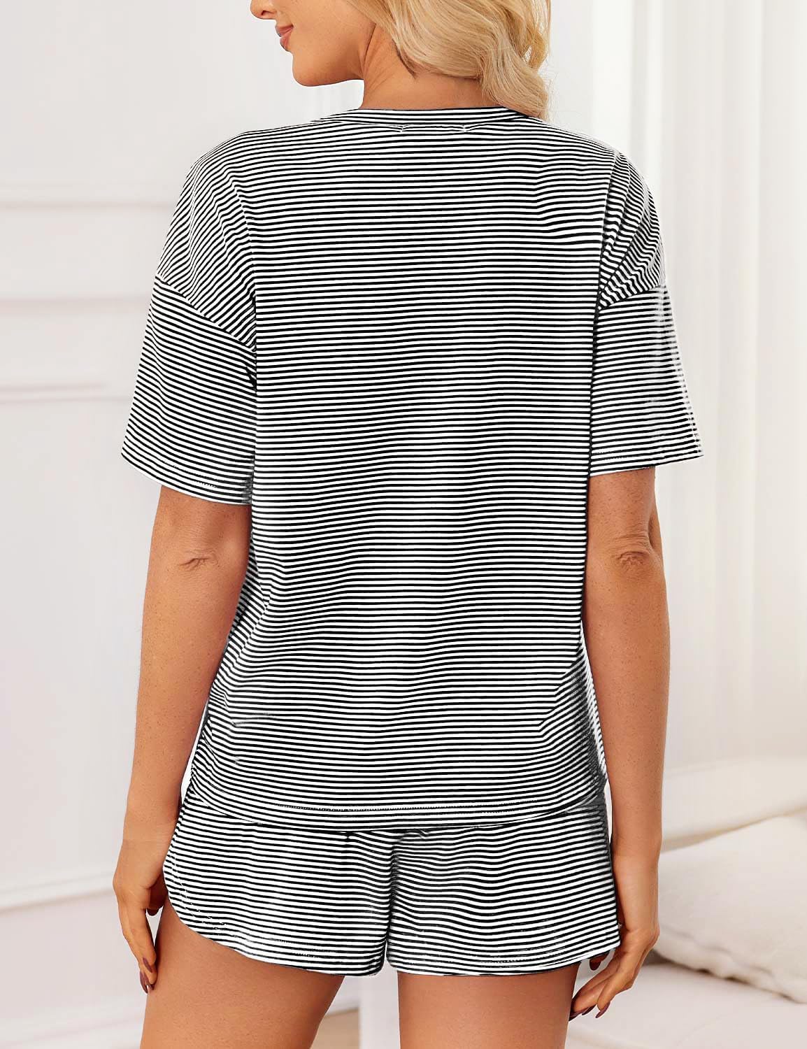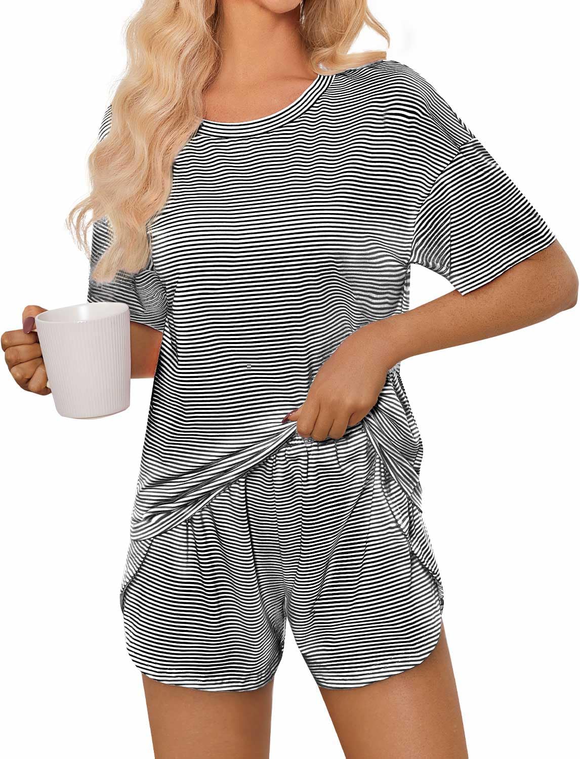 JUSTFASHIONNOW Womens Pajama Sets Shorts Striped Print Two Piece Lounge Sets Crew Neck Sleepwear Split Shorts Set Soft Pjs