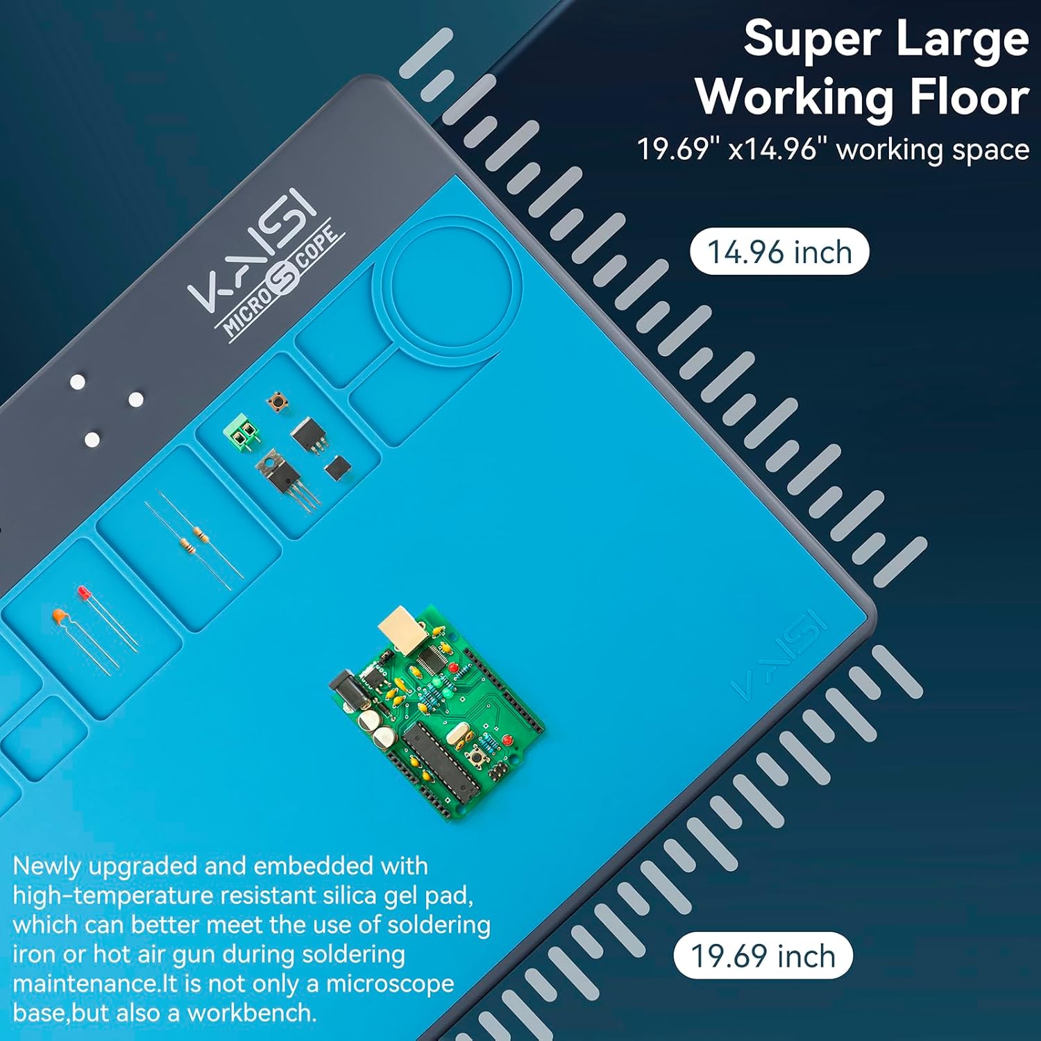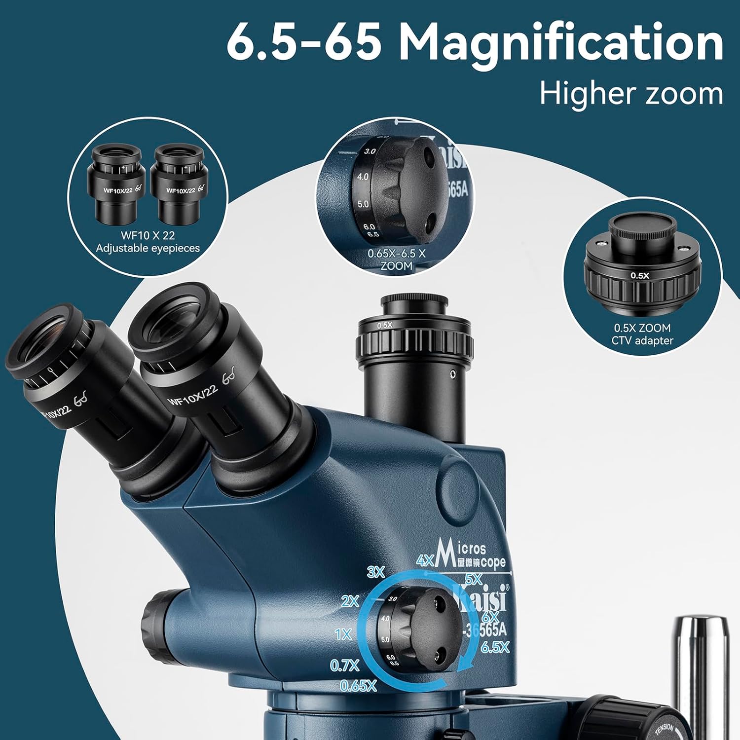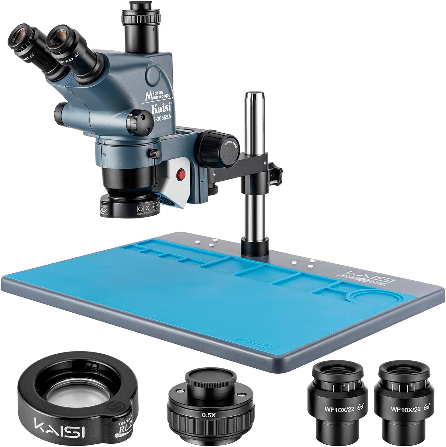 Kaisi Trinocular Stereo Microscope for Professional Repairer Soldering,6.5X-65X Magnification and Adjustable WF10x22 Eyepieces,Extra Large Silicone Working Table,Retractable Stand Zoom Microscope