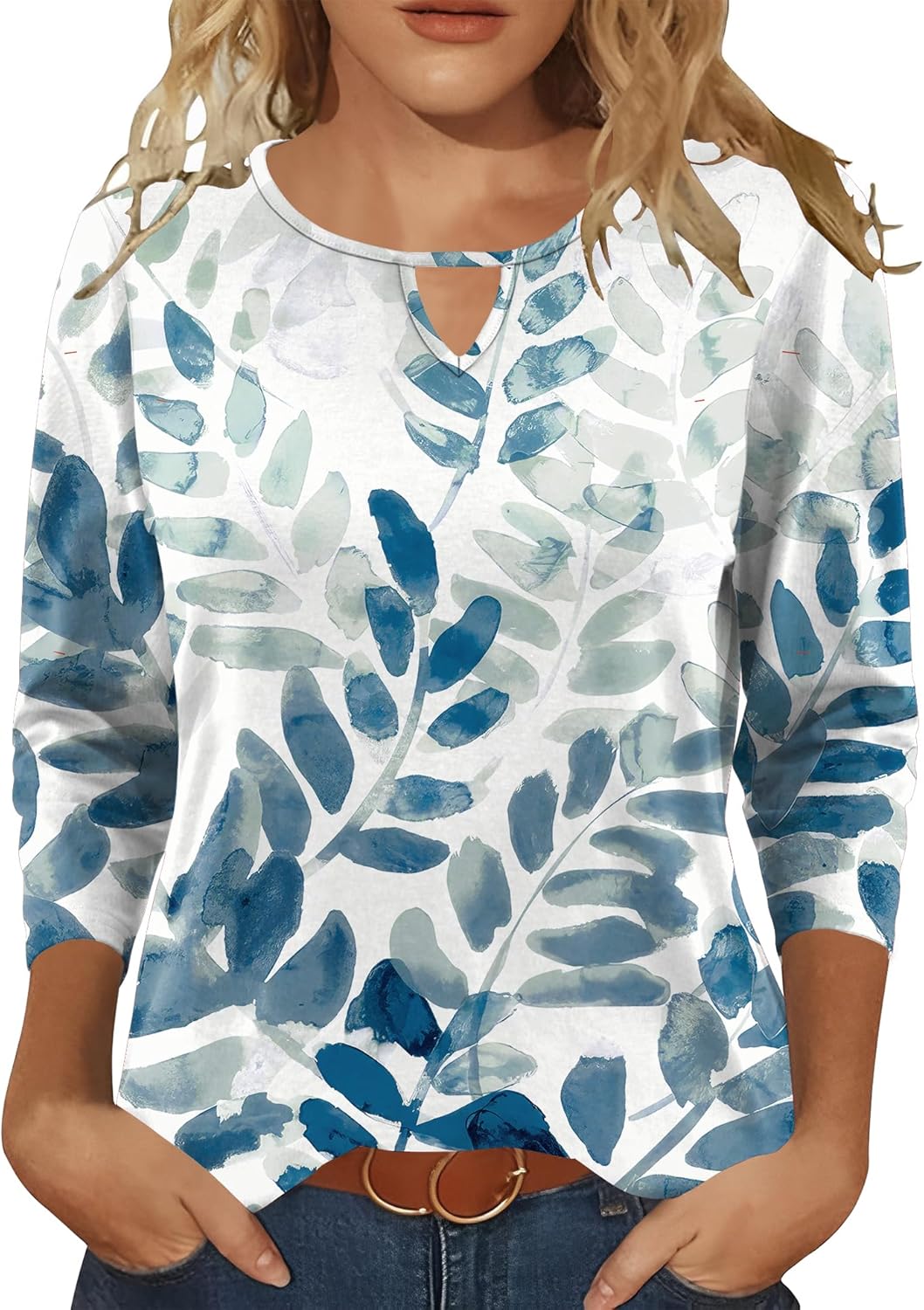 Romanstii 3/4 Length Sleeve Womens Tops Keyhole Crewneck Shirts Business Dressy Casual Tunic Blouses Summer Basic Tees