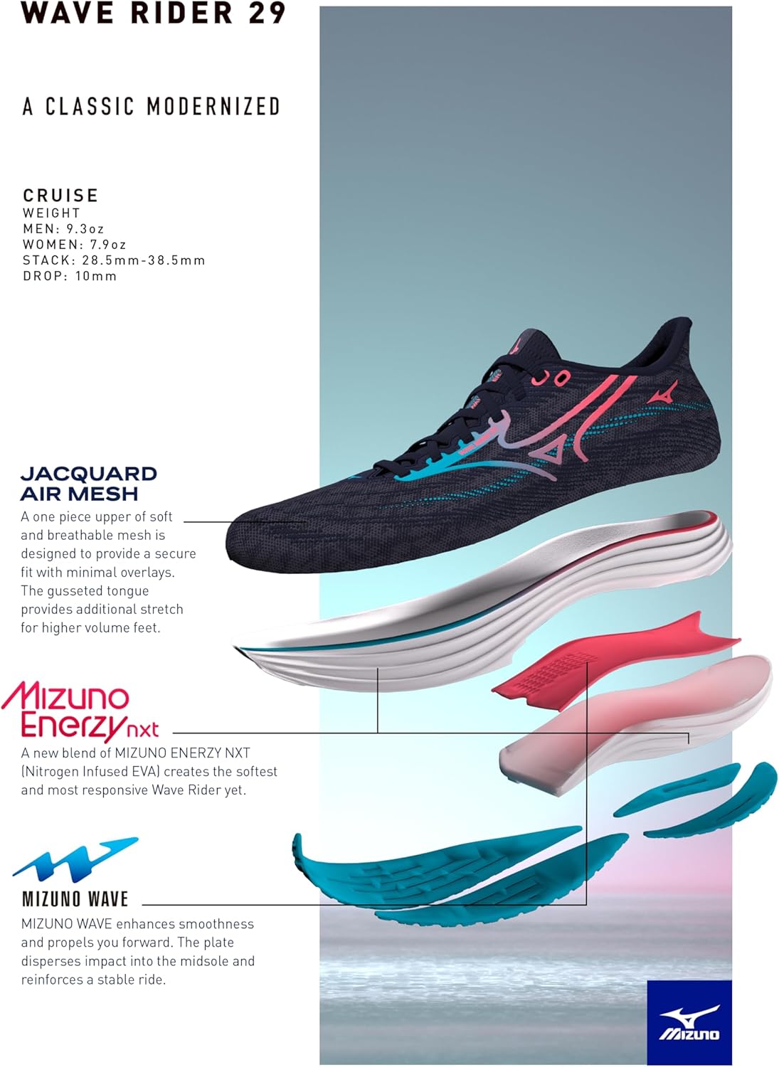 Modernized and simplified for smoothness in every step. The Wave Rider 29 combines a recalibrated underfoot feel delivered by MIZUNO ENERZY NXT (Nitrogen Infused TPU) with MIZUNO WAVE for balanced every day cruising. The new 10mm drop and modern materials create an unparalleled daily trainer with a modern ride and the optimal blend of cushioning and responsiveness.