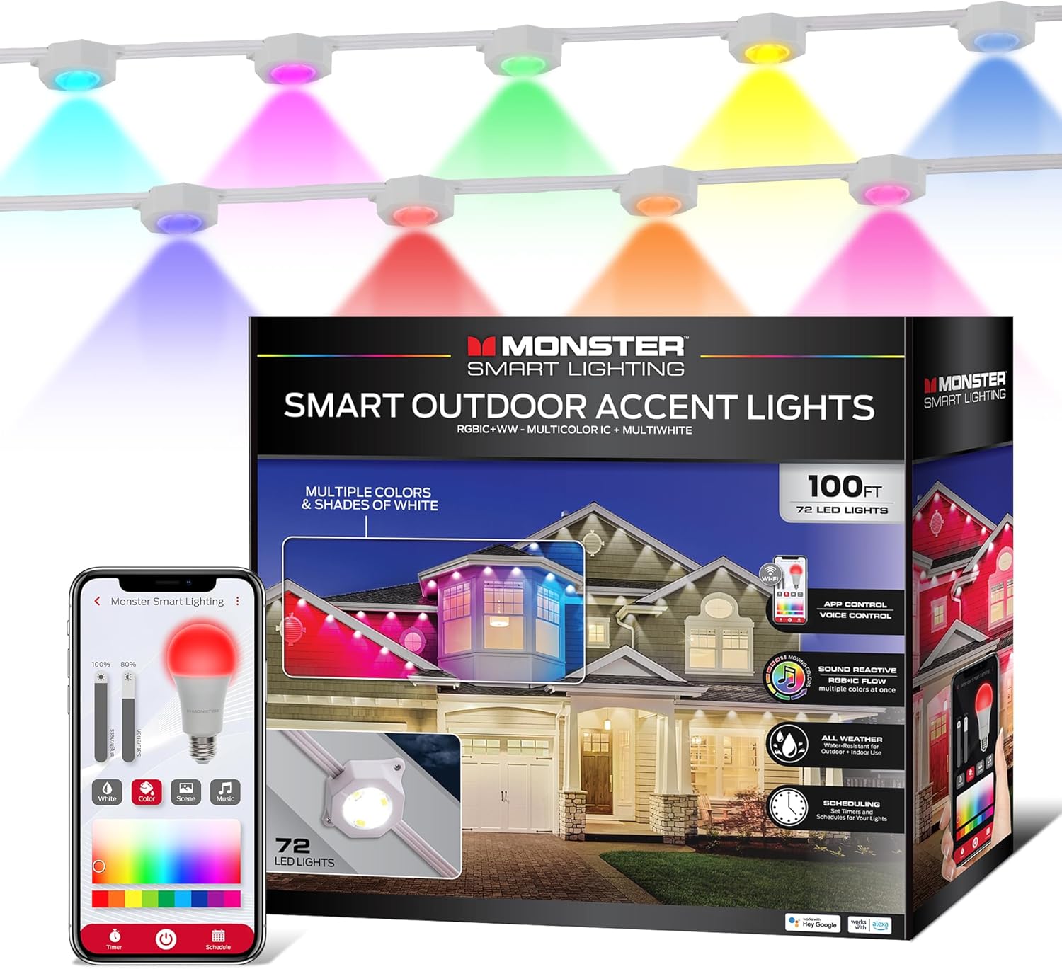 Monster Smart Permanent Outdoor Lights, 100ft, 72 LED Eaves Lights, RGB+IC+WW, Weather & Water Resistant, App & Voice Control, Compatible with Alexa and Google, for Halloween, Christmas & Year-Round
