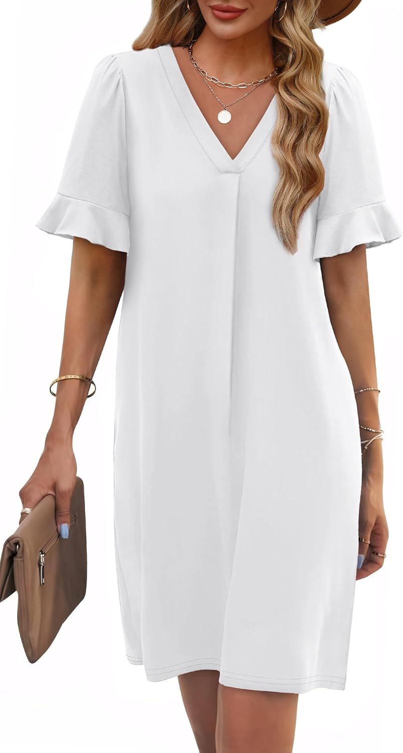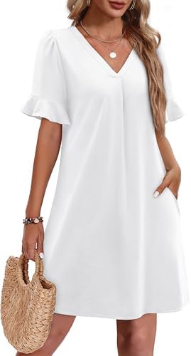 OFEEFAN Summer Dresses for Women Ruffle Short Sleeve V Neck Casual Shift Dress with Pockets