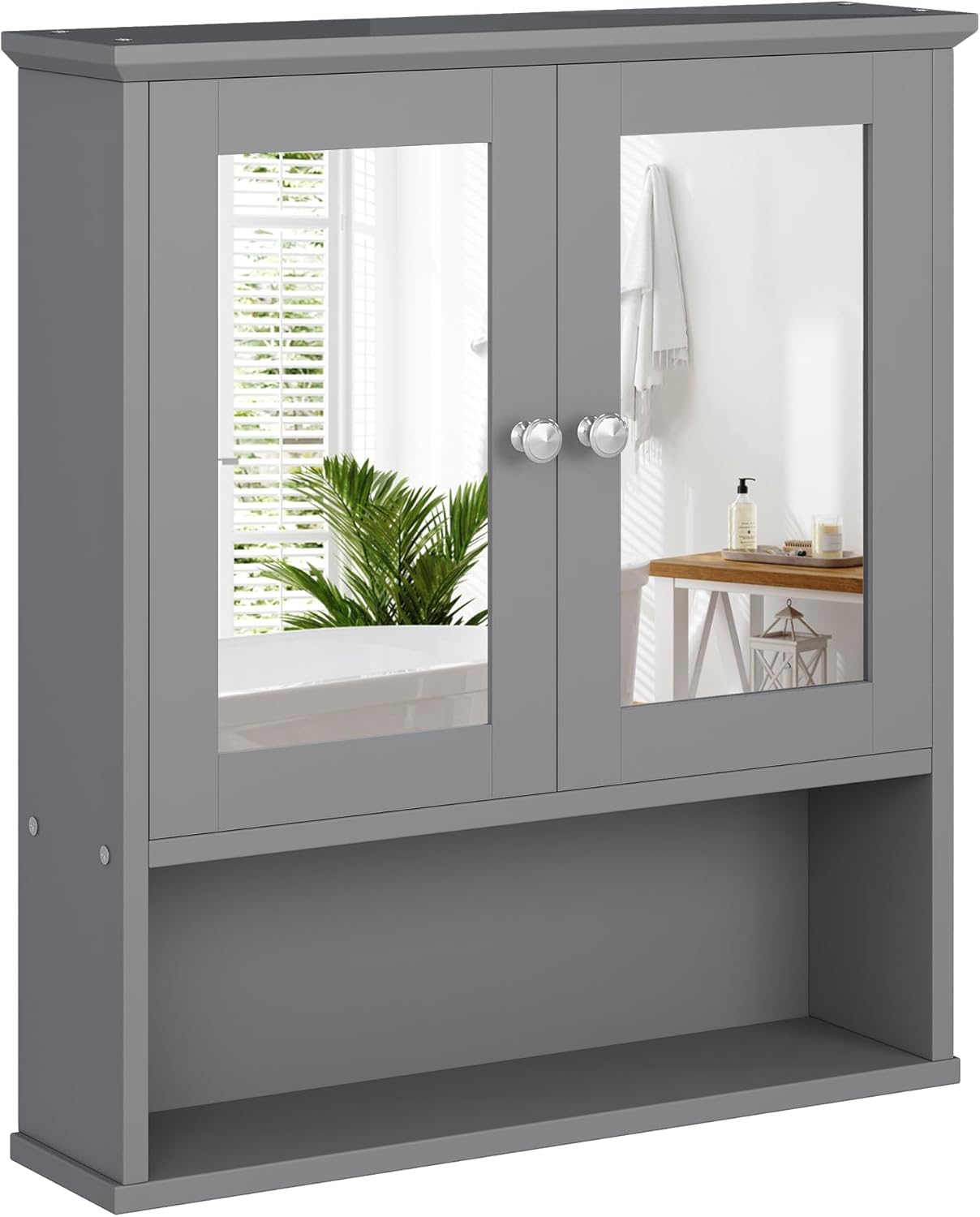 Walsunny Medicine Cabinet Mirror with Storage, Wood Bathroom Wall Cabinet with 2 Vanity Mirror Door and Adjustable Shelfs Wall Mounted for Rv Bathroom Restroom Kitchen, Grey