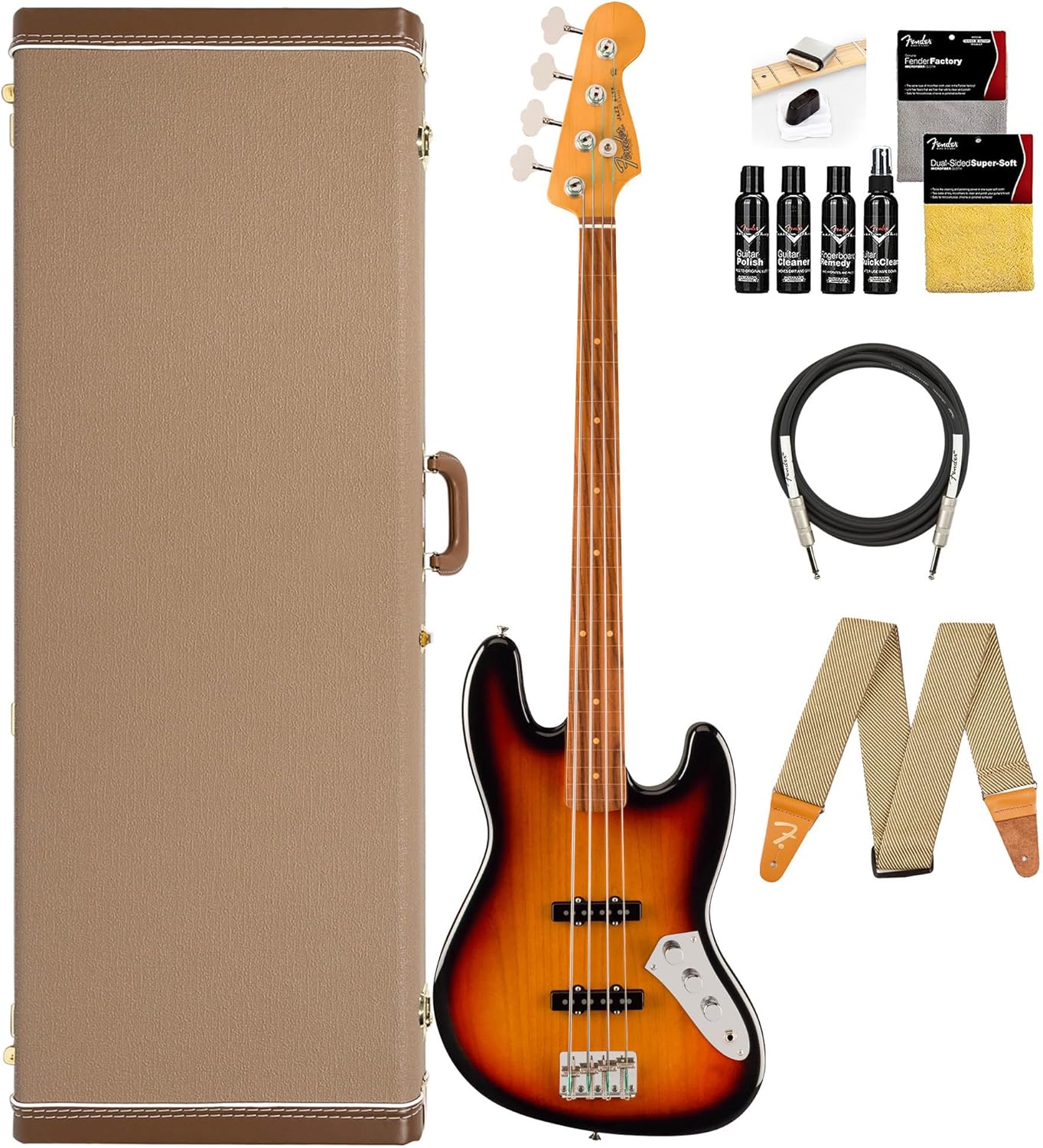 Fender Jaco Pastorius Jazz Bass - 3-Color Sunburst Bundle with Deluxe Hard Case, Strap, Cable, and Guitar Cleaning Kit