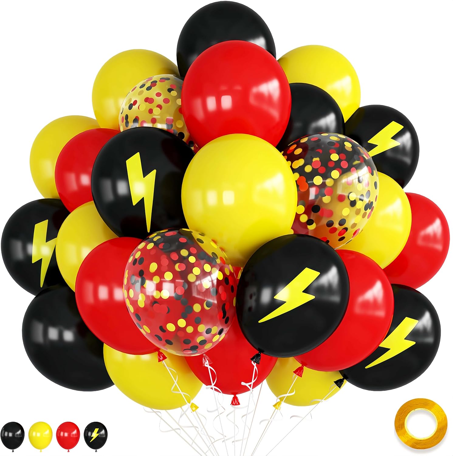 12 Inch Exquisite Party Balloons - Package includes 36 pieces latex party balloons set: Black Lightning Printed Balloons (12-in x 7), Red Gold Black Confetti Balloons (12-in x 3), Black Balloons (12-in x 6), Bright Red Balloons (12-in x 9), Yellow Balloons (12-in x 9), Gold Ribbon 10 Meters long x 1. Exclusive color matching by the stylist, featuring vibrant and rich colors.