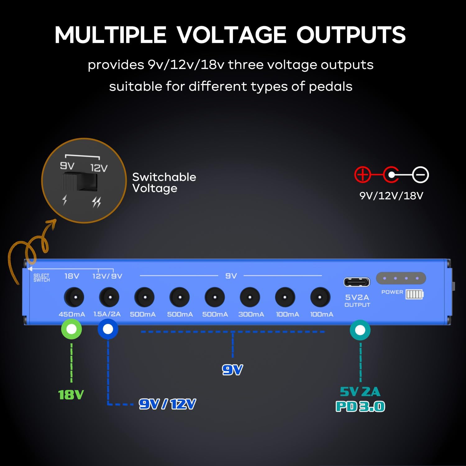 8 High-current DC Outputs: 1x9V/2A or 12V1.5A, 3 x 9V/500mA; 1 x 9V/300mA; 2 x 9V/100mA,1 x 18V/450 mA. It can meet most of effects,some multi-effect,some e- piano, e-drum, percussions and more instruments . And there's also 1 x 5V/2A USB-C Output can load your phone and other devices.