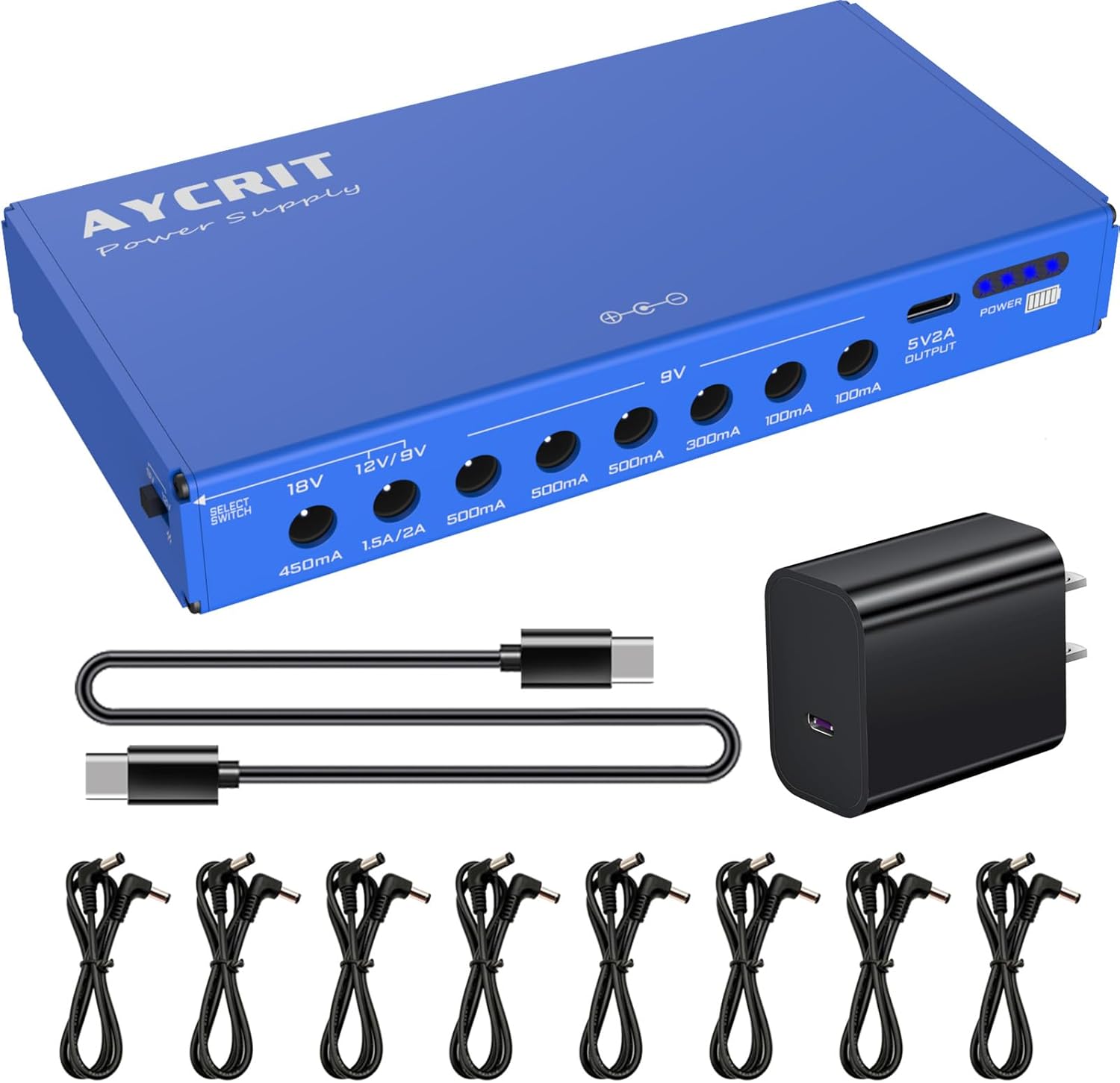 [New Version] AYCRIT Guitar Pedal Power Supply, Rechargeable 12800mAh 9 Outputs 9V2A/12V1.5A/18V450mA and 5V2A Type-C Port for iPhone ipad (MUSTAN-01) Style