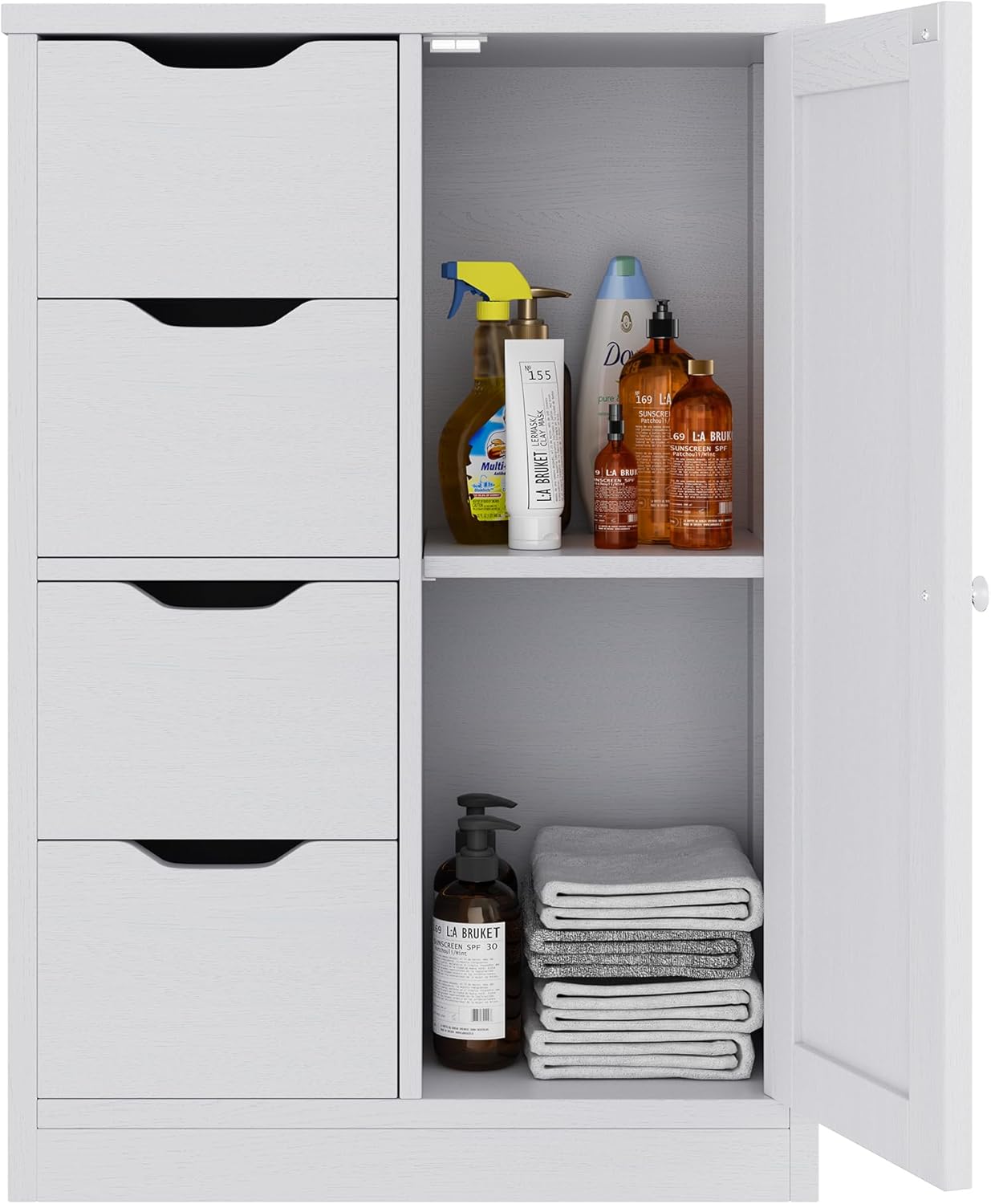 【Ideal Space Saver】If you are searching for a bathroom storage cabinet to store your daily necessities to keep your bathroom in order, Four drawers with cutout handles and one capboard with a customisable shelf allow you to organize a variety of products such as cosmetics, toiletries, towels, and toilet paper. A excellent alternative for storing bathroom debris