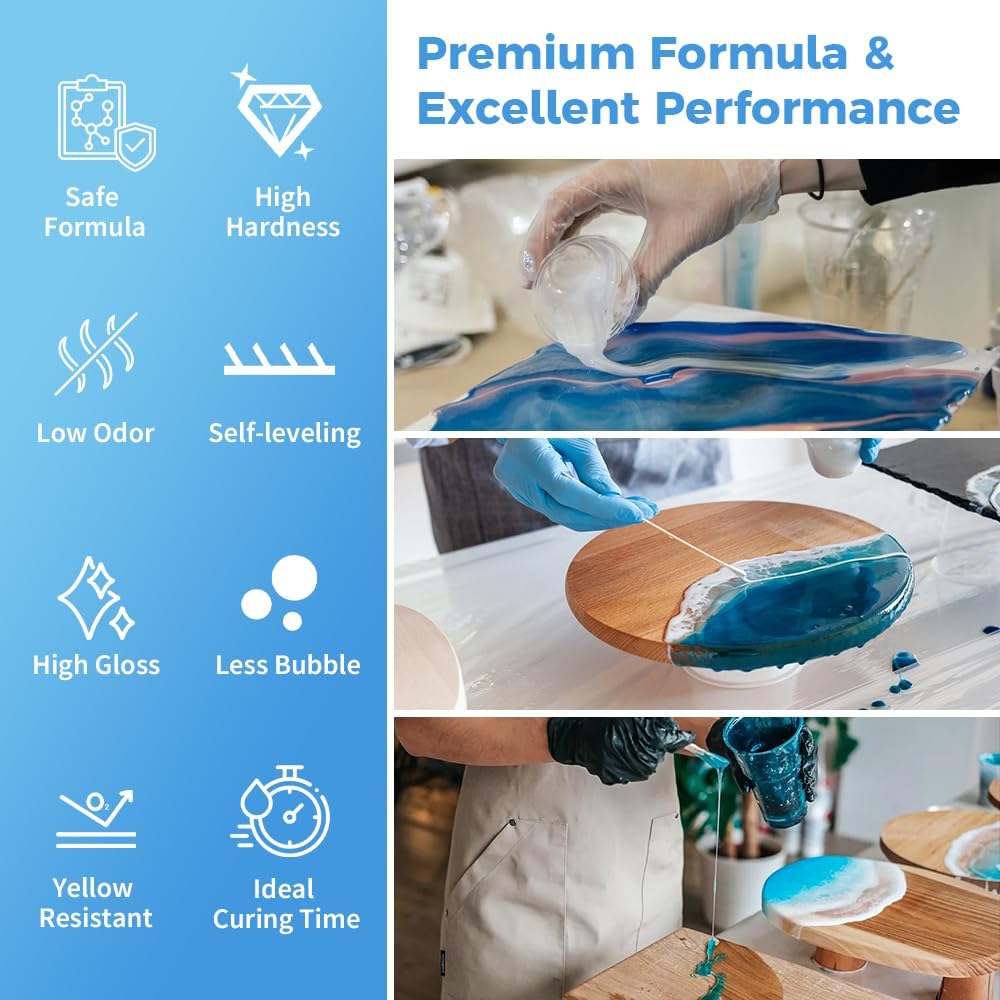 Hard Type & Non-Yellowing: Our improved formula epoxy resin features excellent yellow resistant; 3X UV resistance, ideal for keeping your crafts beautiful for a long time. Shore hardness >85D after fully curing; glass-like finish with great hardness